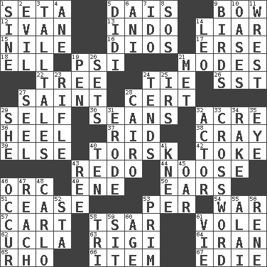 ACROSS 1. Bristle 5. Raised platform 9. Arrow shooter 12. "Terrible" tsar 13. Southeast Asian peninsula 14. One who doesn't tell the truth 15. The longest river in the world 16. "Vaya con ____" 17. Celtic language 18. Pipe bend 19. 23rd letter of the Greek alphabet 21. Methods 22. Relationship diagram 24. Standoff 26. Fast jet (abbr.) 27. Virtuous person 28. Certainty 29. Itself 30. Seines 32. Measure of real estate 36. Person who is morally reprehensible 37. To free from 38. Supercomputer manufacturer 39. Otherwise 40. Cod relative 42. Puff or smoke 43. Do over again 44. Trap for birds or small mammals 46. The grampus (Milton) 49. Compass dir. 50. Hearing organs 51. Stop 53. For each 54. Armed conflict 57. Heavy open wagon 58. Russian ruler of old 61. Short-tailed, large-bodied rat 62. Southern CA. univ. 63. Swiss mountan, "Queen of the Mountains" 64. SW Asia republic 65. 17th letter of the Greek alphabet 66. A distinct part 67. Singer Brickell DOWN 1. Trig term 2. Morally bad or wrong 3. Baron Munchausen's specialties 4. A saturated hydrocarbon 5. "You Light Up My Life" star Conn 6. Cuckoo 7. Wedding promise 8. Mayday 9. Avian creatures 10. Fertile tracts in a desert 11. Obtain by seizing forcibly or violently 14. Lion 19. Fenced enclosure 20. Arranges properly for use 21. Was introduced to 23. Firearm 24. Is inclined (to) 25. Big collection agency 27. Sew up the eyelids of hawks and falcons 28. Capital of Egypt 29. A female animal or person 31. Wear away 32. Thespian 33. What you're doing now 34. Immoral or dissolute person 35. Sight organ 40. Nine, plus one 41. Leg joint 43. To separate or throw off 45. Rowing implement 46. Come to pass 47. Arrive at 48. Monte _, Las Vegas Hotel/Casino 52. R.R. building 53. Demure 55. Jai _ 56. French philosopher Descartes 58. Three (prefix) 59. Be seated 60. Mature 61. Compete