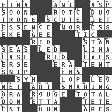 ACROSS 1. Inactive volcano in Sicily 5. Black tropical American cuckoo 8. Cleo's killer 11. Within a short period 12. College mil. group 14. Superhero pair 15. Marketplace scale 17. Turtle shell scale 18. Type of plane 19. Core 21. And not 22. Double-curved letter 23. Supplement with great effort 24. Unit of force equal to gravity 25. Nervous spasm 27. To free from 28. Comedian Laurel of Laurel & Hardy 31. Oceans 35. Directed 37. Pale green bean 38. Comfort 39. River (Sp.) 41. Nights before holidays 42. Celtic language 43. Period 45. Portable shelter 46. Sever or remove by pinching or nipping 47. Followers of ems 49. Symbol (abbr.) 51. Trim (branches) 52. Lion 55. Was introduced to 57. Nonscientific branch of learning 60. Catching in a trap 62. Mouth or opening 63. Makeup applied to the cheeks 65. Add up to 66. Spanish title 67. Singer James 68. False hair 69. Eastern Standard Time (abbr.) 70. Attila the _ 71. Ancient Greek god of war DOWN 1. First name in cosmetics 2. Cod relative 3. Trap for birds or small mammals 4. Queen of England 1702-14 5. Curve 6. Part of speech 7. "Tell ____ the Marines!" 8. Descriptive word 9. Takes to court 10. Cooking vessels 13. Sure thing 16. Engineer (abbr.) 17. Sowing specialist 20. To provide with a ceiling 26. Small island 29. So be it 30. Political cartoonist Thomas 31. Perceives with the eye 32. Merit 33. Aide 34. Not well drained, as in land 36. Expire 40. Threatening words 44. Soon (poet.) 48. Argument over a trivial matter 50. Female horse 52. 61 cubic inches 53. Related on the mother's side 54. Stares at amorously 55. Method 56. Greek god of love 58. Writer of Portnoy's Complaint (1969) 59. Ballerina skirt 61. Roll call or roster of names 64. Separate the seeds from cotton