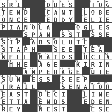 ACROSS 1. Indian title of respect (Mr.) 4. Lyric poems 8. Coat; cloak 11. Watch over 13. Patter 14. Ear part 15. Single time 16. Whirlpool 17. Writer Wiesel 18. Player piano 21. Stares 22. Connect, as a bridge 23. Fast jet (abbr.) 25. Compass dir. 26. Small drink 29. Utter; complete 32. Staphylococcus 34. Observe 35. Beverage made from leaves 38. Water source 39. Women servants 41. Southern CA. univ. 43. Madame (abbr.) 44. Mature 45. Japanese brewing company 46. Electrical Measurement 50. Shoshoni 51. Player for Phoenix 54. Double-curved letter 55. Ooze 57. Go after with the intent to catch 59. Legislator 63. Compass direction 64. Tenth: prefix 67. Actor's bit 68. Singer James 69. Extremities 70. Locale of original sin 71. Marina Del _, California 72. Egg locale 73. Compass dir. DOWN 1. Cease 2. Painter Guido (1575-1642) 3. South American Indian 4. Seas 5. Male parent 6. Conclude 7. Filthy place 8. For Whom the Bell _____ 9. Off-Broadway awards 10. Honkers 12. Cub Scout units 14. Part of a journey 19. Brightly colored fish 20. Experiment locale 21. Baseball player Mel 23. Downhill vehicle 24. Takes to court 26. Compass dir. 27. A whole individual unit 28. Inside of hand 30. Flexible twig of a willow tree 31. Needle case 33. Entreaty 36. Shade of tan 37. Came down and settled, as after flight 39. Atlas contents 40. Eras 42. A saturated hydrocarbon 45. Peachy ____! 47. Cartoonist voice _ Blanc 48. Aid 49. Unit of force equal to gravity 51. Bull 52. A salt of uric acid 53. Difficult 56. Diluted with white 58. Call ___ day 60. Event that recurs at intervals 61. Washington bills 62. French philosopher Descartes 64. Lair 65. Compass dir. 66. Music discs