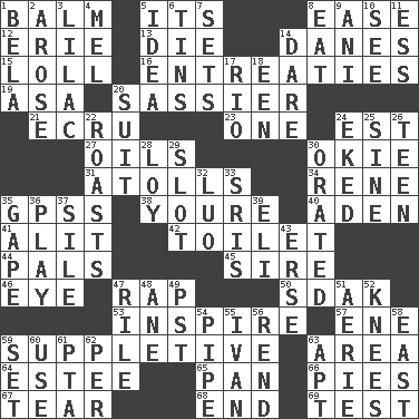 ACROSS 1. Lip ointment 5. ___ a Wonderful Life 8. Comfort 12. 4th largest of the Great Lakes 13. Expire 14. Natives or inhabitants of Denmark 15. Hang loosely or laxly 16. Pleas 19. White ___ sheet 20. More impudent 21. Shade of tan 23. Single 24. Eastern Standard Time (abbr.) 27. Lubricates 30. Migrant worker of the '30s 31. Ringlike coral islands and reefs 34. French philosopher Descartes 35. Global Positioning Systems (abbr.) 38. You are 40. Arabian gulf 41. Set down 42. Bathroom plumbing fixture 44. Friends 45. Father 46. Sight organ 47. Hit sharply and swiftly 50. Neighbor of Neb. 53. Stimulate to action 57. Compass dir. 59. Supplementary 63. Length times width 64. First name in cosmetics 65. Baking dish 66. Sliced desserts 67. Lacerate 68. Conclude 69. Trial DOWN 1. Actor Lugosi 2. Came up 3. Pale purple color 4. Cartoonist voice _ Blanc 5. The main thing one is thinking about 6. Airtight sealed metal containers 7. Arranges properly for use 8. Consume 9. Cuckoo 10. Observe 11. Curvy letter 14. Have the gumption 17. _ de Janeiro 18. Car or cant ending 20. Set of matching outer garments 22. Ridicules or criticizes harshly 24. Supplemented with great effort 25. Trig term 26. Adolescent 28. Myrna of the movies 29. Notch 30. Declaimed 32. Nilotic language 33. Indian titles of respect 35. Open wide 36. Shaw product 37. Filth; sediment 39. Connecticut Ivy Leaguer 43. Celtic language 47. Cause heat under the collar 48. A saturated hydrocarbon 49. Pacific Standard Time (abbr.) 51. Nest on high 52. Leg joints 54. Corncob 55. _ the terrible 56. Tear apart 58. 90 degrees 59. Put into a specified state 60. Purpose 61. Parent Teacher Association (abbr.) 62. For each 63. Fitting