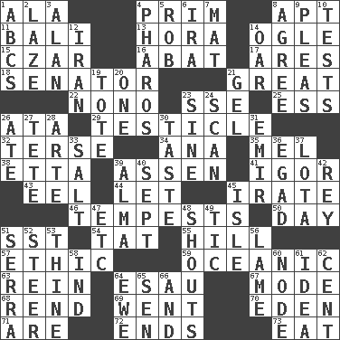 ACROSS 1. According to 4. Demure 8. Fitting 11. Indonesian resort city 13. Israeli folk dance 14. Stare 15. Russian ruler of old 16. Blind as ____ 17. Ancient Greek god of war 18. Legislator 21. Relatively large 22. Words to Nanette 23. Compass dir. 25. Double-curved letter 26. "One Day ___ Time" 29. One of the two male reproductive glands 32. Laconic 34. Santa ___, CA 35. Cartoonist voice _ Blanc 38. Singer James 39. NE Netherlands city 41. Composer Stravinsky 43. Snakelike fish 44. Allow 45. Feeling or showing extreme anger 46. Storms 50. 24 hours 51. Fast jet (abbr.) 54. Make lace 55. Land elevation 57. Value system 59. Pertaining to the sea 63. It's straight from the horse's mouth 64. He sold his birthright 67. Method 68. Tear apart 69. Gone 70. Locale of original sin 71. "We ___ not amused" (Victoria) 72. Extremities 73. Ingest DOWN 1. Lettered men learn these first 2. Goldbrick 3. ____ Jay Lerner 4. N Egypt peninsula 5. Director Reiner 6. Retirement account (abbr.) 7. Floor protector 8. Match 9. Entreaties 10. Trials 12. SW Asia republic 14. Rowing implement 19. Lug 20. Single 21. Set 23. Trig term 24. Skim 26. Had dinner 27. False hair 28. Johnson of "Laugh-In" 30. Clothes sense 31. Arab leader 33. Table seasoning 36. Mild oath 37. Globular water bottle used in Asia 39. _ mater 40. Back-to-school mo. 42. Marina Del _, California 45. Capri or Wight 47. And so on (abbr.) 48. Yells 49. Nervous spasm 51. Spanish missionary in California 52. Navigate 53. One or ones belonging to thee 56. Unable to walk 58. Working for oneself (abbr.) 60. Connecting point 61. It may be bright or harebrained 62. Penny 64. She-sheep 65. Elected rep. 66. Also