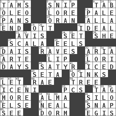 ACROSS 1. Scottish caps 5. Sever or remove by pinching or nipping 9. Bar bill 12. Butter sub 13. Old wives' tales, e.g. 14. Diluted with white 15. Zero-star reviews 16. NW Algerian seaport 17. Silent film actress Nazimova 18. Conclude 19. Baseball player Mel 21. Standard of perfection 22. Deliberation 24. Arrange properly for use 26. A female animal or person 27. Any of the three canals of the cochlea 28. Snakelike fish 29. Raised platform 30. All-night dance parties 32. Roberta Peters solo 36. Johnson of "Laugh-In" 37. Mouth edge 38. Australian parrot (variant) 39. 24-hour periods 40. Letch 42. On the rocks 43. Stalk of a moss capsule 44. Pig sounds 46. Allow 49. Actress Charlotte 50. Relationship diagram 51. Ancient Celtic tribe of eastern Britain 53. Personal Computers (abbr.) 54. Label 57. Greater amount 58. _ mater 61. Grain storage tower 62. Otherwise 63. Actress Patricia 64. Fastener 65. Perceive with the eye 66. Dormintory (informal) 67. Armor plate that protects the chest DOWN 1. Drink excessively 2. Actor Alda or Thicke 3. Ananias' fault 4. Mayday 5. Slit 6. And not 7. Lyricist Gershwin 8. Writing instrument 9. Lies 10. Assad's deity 11. Memphis, Tenn. Street 14. Groovy apt. 19. Petroleum 20. Russian ruler of old 21. ___ a Wonderful Life 23. Flower holders 24. Oozy 25. Raised railways 27. "Two Mules for Sister ____" 28. Webber/Rice musical 29. Male parent 31. Having winglike extensions 32. Place in a line 33. Shooting up abruptly 34. Angers 35. Help 40. Ocean 41. College mil. group 43. Indian title of respect (Mr.) 45. Big collection agency 46. Citrus fruits 47. Learning spot: Fr. 48. Laconic 52. Born 53. Inside of hand 55. Jai ____ 56. Republicans 58. Added to 59. Lion 60. Impair 61. Compass dir.