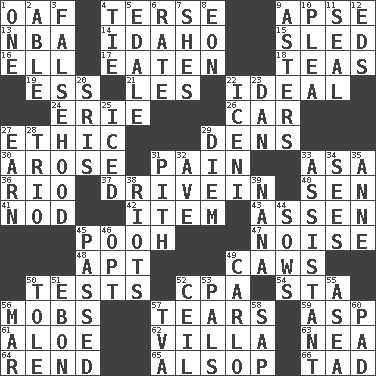 ACROSS 1. Clumsy lout 4. Laconic 9. Domed church section 13. Basketball assoc. 14. Potato state 15. Downhill vehicle 16. Pipe bend 17. Eroded 18. Beverages made from leaves 19. Curvy letter 21. French article 22. Perfect 24. 4th largest of the Great Lakes 26. Auto 27. Value system 29. Hiding places for outlaws 30. Came up 31. Ache 33. White ___ sheet 36. River (Sp.) 37. Popular '50s hangout 40. Elected rep. 41. Allow head to fall sleepily 42. A distinct part 43. NE Netherlands city 45. "Silly old bear" 47. Annoying sound 48. Fitting 49. Crow sounds 50. Trials 52. Accounting whiz (abbr.) 54. R.R. building 56. Crowds into 57. Pulls into pieces 59. Viper 61. _ vera 62. Country estate 63. Teachers' org. 64. Tear apart 65. Columnist Joseph or Stewart 66. Bit DOWN 1. Single 2. Competent 3. It jiggles the polygraph 4. Neckwear 5. Peak District village in England 6. Assign a rank or rating to 7. "______ My Girl" (Turtles hit) 8. A really long time 9. Michaelmas daisies 10. Entreaty 11. Lick closed 12. Begley and Asner 20. Indian titles of respect 22. Ancient Celtic tribe of eastern Britain 23. Daniel's nick name 25. On the rocks 27. Merit 28. Musical group of three 29. South Vietnam president (1954) 31. Heart or essence 32. "___ Maria" 33. Aide 34. Perceives with the eye 35. Queen of England 1702-14 38. Disturbances 39. Nanny 44. Sty mamas 45. Went by 46. Choose 49. Monte _, Las Vegas Hotel/Casino 50. Lacquered or enameled metalware 51. Inky black, to poets 52. To provide with a ceiling 53. Friends 55. Toward the sea 56. Make imperfect 57. Federal power corp. 58. Plant excrement 60. Writing tablet