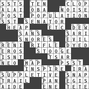 ACROSS 1. Fast planes 5. Nine, plus one 8. Hoof sound 12. Mountain range southwest of Kyrgyzstan 13. Chief or king in Benin or Nigeria 14. Annoying sound 15. Mail 16. Census information 19. Fast jet (abbr.) 20. Elected representative 21. Pile 23. And so on (abbr.) 24. Morning condensation 27. Without 30. Indian skirt 31. Sounds asleep 34. Morally bad or wrong 35. Painter Guido (1575-1642) 38. Ransack; plunder; pillage 40. Colored 41. Greek god of love 42. Moe Howard, for one 44. Is not 45. Russian ruler of old 46. Modern: prefix 47. Atlas unit 50. Inconspicuous attention getter 53. Heighten or intensify 57. Retirement account (abbr.) 59. Supplementary 63. Fastener 64. Hang back 65. Baking dish 66. The front part of a cuirass 67. Helper 68. Compass dir. 69. False hair DOWN 1. Plant excrements 2. Splash clumsily 3. Clothes sense 4. Be seated 5. Drink excessively 6. Inky black, to poets 7. California wine valley 8. Small bed 9. Cards in a Roman deck? 10. Bear (Spanish) 11. Fenced enclosure 14. Drug cop 17. Shoshoni 18. Car dealer's back yard 20. Connect, as a bridge 22. Aid 24. American folk hero Crockett 25. One of the Great Lakes 26. Uncontrolled 28. And not 29. Indian titles of respect 30. Spring feasts 32. Newt 33. Groove 35. It's straight from the horse's mouth 36. Celtic language 37. Words to Nanette 39. Greek goddess of the dawn 43. Open wide 47. Place where flour is made 48. A saturated hydrocarbon 49. Pacific Standard Time (abbr.) 51. Burn superficially 52. Distinguishing feature 54. Corncob 55. "Terrible" tsar 56. French philosopher Descartes 58. Domed church section 59. R.R. building 60. RI univ. 61. Groovy apt. 62. Sliced dessert 63. Put into a specified state