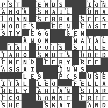 ACROSS 1. Pacific Standard Time (abbr.) 4. Conclusions 8. Electrically charged atom 11. Small Philippine buffalo 13. Slow-paced one 15. Heredity factor (abbr.) 16. Grant temporary use of 17. Father Junipero _ 18. Observes 19. Methods 21. Car or cant ending 22. Compass direction 23. Filthy place 24. Oval reproductive body of a fowl 27. Commissioned military rank (abbr.) 29. At once, immediately (arch.) 30. Relating to or accompanying birth 34. Make lace 36. Cooking vessels 39. Vertical member of a panel or frame 40. Pacific island yam 41. Obscenities 43. Wrote a lyric poem 44. Make improvements or corrections to 46. Suggestive of the supernatural 47. To riddle 48. Slender Brazilian palm 49. Lodging establishments 51. French article 53. Personal Computers (abbr.) 54. Purpose 57. Slanted text style (abbr.) 60. Lion 63. Man or boy (slang) 65. Have confidence or faith in 66. Believer in; advocate of (suffix) 69. Play the lead 70. Environmental prefix 71. Child's nurse 72. One of the Great Lakes 73. A female animal or person 74. Three-handed card game 75. Added to DOWN 1. Insides of hands 2. Snout, nose 3. Sycophant 4. Double-curved letter 5. Compass dir. 6. Have the gumption 7. Beget 8. It may be bright or harebrained 9. Singles 10. Political cartoonist Thomas 12. One (Scot) 14. Austrian-born American filmmaker Fritz 18. Elected representatives 20. Elected rep. 25. Republicans 26. Dwarf 28. Followers of ems 29. Without tonality 31. Periodic rise and fall of the sea level 32. Toward shelter 33. Directed 34. Scottish caps 35. Ancient Greek god of war 37. Third day of the wk. 38. Empty completely 40. Afternoon social gathering 42. Synchronize (abbr.) 45. Pass on 50. Overdraft (abbr.) 52. Broad, flat, thick piece 54. Extreme 55. Killed 56. Having ears or earlike features 57. Angers 58. Technical work 59. Medicinal plant 61. Greek god of love 62. Pig sound 64. Compass dir. 67. Santa ___, CA 68. Remaining after all deductions