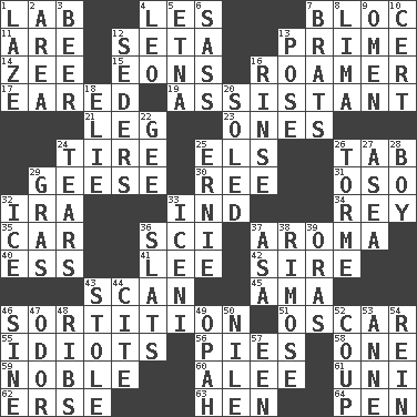ACROSS 1. Experiment locale 4. French article 7. Alliance 11. "We ___ not amused" (Victoria) 12. Stalk of a moss capsule 13. First class 14. Last letter of the English alphabet 15. Immeasurably long periods of time 16. Nomad 17. Having ears or earlike features 19. Helper 21. Part of a journey 23. Washington bills 24. Become fatigued 25. Raised railways 26. Bar bill 29. Honkers 30. Portuguese money of account (variant) 31. Bear (Spanish) 32. Retirement account (abbr.) 33. Indiana (abbr.) 34. Marina Del _, California 35. Auto 36. _-fi 37. Scent 40. Curvy letter 41. Area sheltered from the wind 42. The founder of a family 43. Skim 45. Nursemaid (var.) 46. Drawing lots 51. Witty Wilde 55. Foolish or stupid persons 56. Sliced desserts 58. Single 59. Having high moral qualities 60. Toward shelter 61. Single; one (prefix) 62. Celtic language 63. Layer 64. Fenced enclosure DOWN 1. Goldbrick 2. Length times width 3. Fermented drink made from hops 4. Lion 5. Inactive volcano in Sicily 6. Backtalk 7. Naughty children 8. Pale green bean 9. Sign of something about to happen 10. An absolute certainty 12. Spring feasts 13. Airs 16. Wash lightly 18. Writer Wiesel 20. Having a sole or soles 22. Unit of force equal to gravity 24. Rends 25. Bert's buddy 26. Singer Mel 27. Toward the sea 28. Male child 29. Pate de foie ____ 32. Frozen water 33. Ancient Celtic tribe of eastern Britain 36. Narrow boards 37. White ___ sheet 38. Full of chinks, cracks, or crevices 39. Mouths or openings 43. Took without asking 44. Quote 46. Trig term 47. Scent 48. Chest bones 49. Brightly colored fish 50. Mediterranean tributary 52. Clever action or accomplishment 53. Queen of England 1702-14 54. It's straight from the horse's mouth 57. Car or cant ending