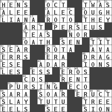 ACROSS 1. Coop moms 5. Sep. follower 8. It was, poetically 12. Toward shelter 13. Actor Baldwin 15. Ending for "Through" and "Enough" 16. Climbing, woody, usually tropical vines 18. Printing process, for short 19. Those things 20. Tate display 22. Son of Zeus who helped slay Medusa 24. Afternoon social gatherings 26. And not 27. Pledge 28. Elected rep. 29. Teat (slang) 32. Dry up 35. Round or rotation of duties 37. Actress Gardner 38. Blunders 39. Epoch 40. To draw with force 41. Compass dir. 42. The sixth month of the Jewish calendar 43. Charged atoms 44. French article 45. Curvy letter 46. Greek god of love 49. Music discs 50. Monthly bill 51. Puckering 55. Environmental prefix 56. "Two Mules for Sister ____" 57. Fly high 59. Spew [out] 63. Kill 64. Ballerina skirt 65. Relationship diagram 66. Snakelike fish 67. Observe 68. The Jewish people; Israel DOWN 1. Actor Linden 2. Biblical high priest 3. Teachers' org. 4. Legislators 5. Boat paddle 6. Hoof sound 7. Wig 8. Carrier 9. Chinese city south-southwest of Nanjing 10. Matures 11. Like a shrinking violet 14. Pupil covering 17. Length times width 21. Make lace 23. Male child 25. Fragments 28. A viewer who gazes fixedly 29. Edible starchy tuberous root 30. "Terrible" tsar 31. Labels 32. Stitch closed the eyes of (a falcon) 33. Celtic language 34. Ancient Greek god of war 36. Mouth or opening 40. What propaganda does 42. Aid 45. Begley and Asner 47. To riddle 48. Single time 49. Trading vessels 51. Diluted with white 52. Mountain range 53. Horse sense 54. Yard entry 56. Compass dir. 58. Regret 60. RI univ. 61. Corporate head (abbr.) 62. "___ Little Indians"