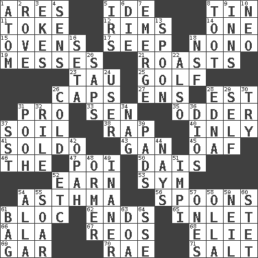 ACROSS 1. Ancient Greek god of war 5. Binary compound 8. Metal container 11. Casino tip 12. Basketball hoops 14. Single 15. Baking chambers 17. Ooze 18. Words to Nanette 19. Makes clutter 21. Cooks with dry heat, as in an oven 23. The 19th letter of the Greek alphabet 25. Eighteen holes 26. Balmoral and tarboosh 27. Followers of ems 28. Eastern Standard Time (abbr.) 31. Adept person 33. Elected rep. 35. More peculiar 37. The visible part of the earth's surface 38. Hit sharply and swiftly 40. Inwardly 41. Twentieth part of a lira 43. Separate the seeds from cotton 45. Clumsy lout 46. Definite Article 47. Luau course 50. Raised platform 52. Merit 53. Symbol (abbr.) 54. Respiratory problem 56. Soup utensils 61. Coalition 62. Extremities 65. An arm off of a larger body of water 66. Chicken ___ king 67. Vintage cars 68. Writer Wiesel 69. Slender fish 70. Actress Charlotte 71. Table seasoning DOWN 1. Smallest unit of an element 2. Be footloose 3. Supplements with great effort 4. Elected reps. 5. Big collection agency 6. Pass on 7. Develop 8. A blast of a horn 9. Lodging establishments 10. Modern: prefix 13. Soup utensil 16. Stalk of a moss capsule 18. Science/research agcy. 20. Plant excrements 22. In addition 24. One who makes use of a thing 26. Chilled 28. Pulitzer Prize-winning author Ferber 29. Oneself 30. Attempt to accomplish something 31. "Silly old bear" 32. Cause heat under the collar 34. Tired old horse 36. "Vaya con ____" 37. Fast jet (abbr.) 39. Groovy apts. 42. Brightly colored fish 44. Negative votes 48. Channel Islands abalone 49. More empty; more void 51. Body of Kaffir warriors 52. And so on (abbr.) 54. Silent film actress Nazimova 55. Fly high 57. Singles 58. Rounded earthenware pot or jar 59. Famous astronaut Armstrong 60. Proofreading order 61. Paper or plastic container 63. ___ good deed 64. Compass dir.