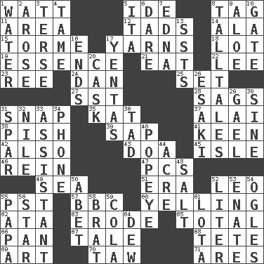 ACROSS 1. Electrical Unit 5. Binary compound 8. Label 11. Type of rug 12. Small amounts or degrees 14. Wing 15. Singer Mel 17. Entertaining tales 18. Car dealer's back yard 19. Core 21. Ingest 22. Area sheltered from the wind 23. Portuguese money of account (variant) 24. Daniel's nick name 25. Arrange properly for use 27. Fast jet (abbr.) 28. Droops 31. Fastener 35. Krazy ___ of comics 37. Jai ____ 38. Expression of disdain 39. Plant excrement 41. Peachy ____! 42. In addition 43. ___ good deed 45. Capri or Wight 46. It's straight from the horse's mouth 47. Personal Computers (abbr.) 49. Ocean 51. Epoch 52. Lion 55. Pacific Standard Time (abbr.) 57. English channel? 60. Crying or shouting loudly 62. "One Day ___ Time" 63. Wear away 65. "_____ Recall" 66. Baking dish 67. Falsehood 68. False hair 69. Nonscientific branch of learning 70. The 23rd letter of the Hebrew alphabet 71. Ancient Greek god of war DOWN 1. Wetness 2. Came up 3. Laconic 4. Not wild 5. Call ___ day 6. Have the gumption 7. Pulitzer Prize-winning author Ferber 8. Baron Munchausen's specialties 9. Medicinal plant 10. Yard entry 13. Fast planes 16. Extremities 17. Gossips 20. Keg 26. 1973 Nobel Price Winner (Physics) Leo 29. Highlander 30. Trig term 31. Practice fight 32. "Death on the ____" 33. Helper 34. Give a jingle 36. Small amount or degree 40. Wimpy's pal 44. 43,560 square feet 48. Table seasoning 50. Collude with 52. 61 cubic inches 53. Related on the mother's side 54. Stares 55. Dad 56. Play the lead 58. Naughty child 59. Root beer relative 61. Globular water bottle used in Asia 64. Morning condensation