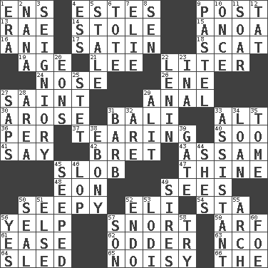 ACROSS 1. Followers of ems 4. _____ Park, CO 9. Mail 13. Actress Charlotte 14. Fur scarf 15. Small Philippine buffalo 16. Cuckoo 17. Smooth fabric 18. Scram, to a cat 19. Grow older 21. Area sheltered from the wind 22. 61 cubic inches 24. Characteristic smell of wine 26. Compass dir. 27. Virtuous person 29. Of or related to the anus 30. Came up 31. Indonesian resort city 33. Keyboard modifier key 36. For each 37. Lacerating 40. "Barney Miller" actor Jack 41. Declare 42. Cy Young winner Saberhagen 43. Indian state 45. Oscar Madison type 47. One or ones belonging to thee 48. Period of immesurable duration 49. Perceives with the eye 50. Not well drained, as in land 52. Biblical high priest 54. R.R. building 56. Sharp bark 57. Derisive sound 59. Sandy's bark 61. Relaxation 62. More peculiar 63. Non-commissioned officer (abbr.) 64. Downhill vehicle 65. Annoyingly loud 66. Definite Article DOWN 1. Period 2. Grandmother 3. Signiory (variant) 4. Double-curved letter 5. Showing deterioration from age 6. Haul 7. Writer Wiesel 8. Elected rep. 9. Soft color 10. At one time in the past 11. Fly high 12. Make lace 20. Immeasurably long periods of time 22. Soviet premier 1918-24 23. _ tizzy (2 wds.) 25. Proofreading order 27. Plant excrements 28. Type of rug 29. Came down and settled, as after flight 31. Sharp remark 32. "We ___ not amused" (Victoria) 33. Aide 34. Grant temporary use of 35. Heavy book 38. Black 39. Yard entry 44. "______ My Girl" (Turtles hit) 45. Oozed 46. Trim (branches) 49. Titles for men of rank and authority 50. Lick closed 51. Otherwise 52. Inside; within (prefix) 53. Farming town in central California 55. Bowlike part 56. Affirmative reply 57. Male child 58. Attempt 60. Enemy