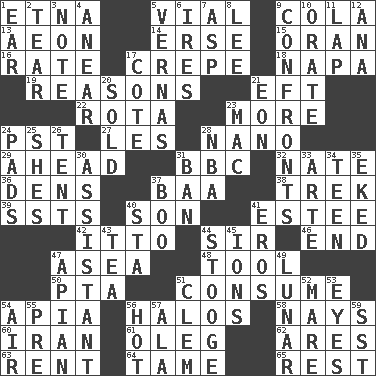 ACROSS 1. Inactive volcano in Sicily 5. Small bottle 9. Root beer relative 13. Period of immesurable duration 14. Celtic language 15. NW Algerian seaport 16. Pace 17. Streamer paper 18. California wine valley 19. Thinks logically 21. Lizard (obsolete) 22. Roll call or roster of names 23. Greater amount 24. Pacific Standard Time (abbr.) 27. French article 28. Billionth: prefix 29. Forward in time 31. English channel? 32. Nathan's nickname 36. Cub Scout units 37. Sound made by sheep 38. Long journey 39. Fast planes 40. Male offspring 41. First name in cosmetics 42. "Tell ____ the Marines!" 44. Title for a knight 46. Conclude 47. At sea 48. Instrument 50. Parent Teacher Assoc. 51. Eat 54. Capital of Western Samoa 56. Auras 58. Negative votes 60. SW Asia republic 61. Cassini of fashion 62. Ancient Greek god of war 63. Monthly bill 64. Not wild 65. Remainder DOWN 1. Ewer handle 2. Pull apart 3. Make mention of 4. Approach 5. Actresses Bloom and Felton 6. Angers 7. Cleo's killer 8. Area sheltered from the wind 9. Meets 10. Speak pompously 11. Pet locale 12. Santa ___, CA 17. ____ d'Azur (French Riviera) 20. Exchanged or delivered for money 21. A really long time 23. Apple computer (short form) 24. Groovy apts. 25. "______ My Girl" (Turtles hit) 26. Portable shelter 28. Basketball assoc. 30. Aide 31. Bar 33. Johnson of "Laugh-In" 34. Adolescent 35. Supplemented with great effort 37. Surprise greeting 40. R.R. building 41. Greek god of love 43. Beverage made from leaves 44. Moe Howard, for one 45. Charged atoms 47. Bee-related 49. Type of eclipse 51. Clement's nick name 52. Female horse 53. Sight organs 54. Wind 55. Before (prefix) 56. Being at a high temperature 57. Insect wing 59. Fast jet (abbr.)