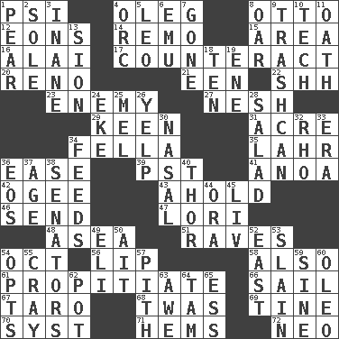 ACROSS 1. Air pressure measure (abbr.) 4. Cassini of fashion 8. "Beetle Bailey" pooch 12. Immeasurably long periods of time 14. San ____ (Riviera town) 15. Length times width 16. Mountain range southwest of Kyrgyzstan 17. Neutralize 20. Western Nevada city 21. Car or cant ending 22. Quiet! 23. Foe 27. Tender 29. Peachy ____! 31. Measure of real estate 34. Chap (slang) 35. Cowardly lion portrayer 36. Comfort 39. Pacific Standard Time (abbr.) 41. Small Philippine buffalo 42. Double curve, resembling the letter S 43. Hold, grip (Informal) 46. Post 47. Australian parrot (variant) 48. Toward the sea 51. All-night dance parties 54. Sep. follower 56. Mouth edge 58. In addition 61. Appease 66. Travel by water 67. Edible starchy tuberous root 68. It was, poetically 69. Prong on a fork 70. System (abbr.) 71. Folds over and sews together 72. Modern: prefix DOWN 1. Lightbulb-shaped fruit 2. Flatfish 3. Silly 4. The grampus (Milton) 5. Lion 6. Australian flightless bird 7. Went 8. Boat paddle 9. File 13 10. Technician 11. Pledge 13. The Jewish people; Israel 18. Nine, plus one 19. Compass dir. 24. Make supply last 25. Cartoonist voice _ Blanc 26. Sharp bark 28. First course 30. Rhinal 32. 17th letter of the Greek alphabet 33. Epoch 34. Gives food to 36. Greek goddess of the dawn 37. Ripen 38. Elected representatives 40. Son of Odin 44. Mouth or opening 45. 54 in ancient Rome 49. Connecticut Ivy Leaguer 50. Small island 52. 90 degrees 53. Killed 54. Chooses 55. Supercomputer manufacturer 57. Heart or essence 59. Trig term 60. Margarine 62. Cooking vessel 63. Deep reverence 64. Scottish cap 65. Double-curved letter