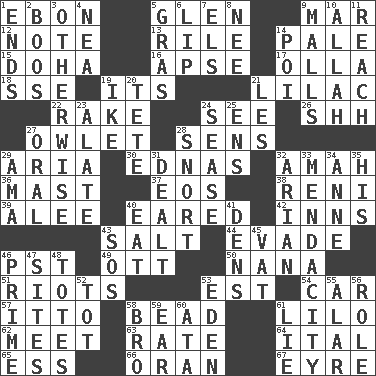 ACROSS 1. Inky black, to poets 5. Small, secluded valley 9. Make imperfect 12. Observe 13. Cause heat under the collar 14. Light colored 15. Capital of the state of Qatar 16. Domed church section 17. Water jar 18. Compass dir. 19. ___ a Wonderful Life 21. Pale purple color 22. Libertine 24. Perceive with the eye 26. Quiet! 27. A small or young owl 28. Elected reps. 29. Operatic vocal solo 30. Ferber et al. 32. Wet nurse 36. Vertical spar for supporting sails 37. Greek goddess of the dawn 38. Painter Guido (1575-1642) 39. Toward shelter 40. Having ears or earlike features 42. Lodging establishments 43. Table seasoning 44. Elude 46. Pacific Standard Time (abbr.) 49. Baseball player Mel 50. Grandmother 51. Disturbances 53. Eastern Standard Time (abbr.) 54. 4-wheeled motor vehicle 57. "Tell ____ the Marines!" 58. Necklace unit 61. _ and Stitch 62. Confront 63. Pace 64. Slanted text style (abbr.) 65. Curvy letter 66. Northwest Algerian city 67. Jane of fiction DOWN 1. Extremities 2. Scornful sounds 3. Else 4. Teachers' org. 5. Pate de foie ____ 6. Mouth edge 7. Raised railways 8. Born 9. Promenades 10. Assad's deity 11. Arrive at 14. Luau course 19. Mamie's mate 20. False hair 21. French article 23. Having winglike extensions 24. Gospel singer Marvin 25. Followers of ems 27. Of the mouth 28. Derisive sound 29. Wet nurse (var.) 31. Started a card game 32. Believer in; advocate of (suffix) 33. Ananias' fault 34. Queen of England 1702-14 35. Part of HMS, perhaps 40. Ingest 41. Hiding places for outlaws 43. Distress signal 45. Large container 46. First class 47. Locates 48. Lugs 52. Small child 53. Locale of original sin 55. Having or resembling wings 56. Hero or heavy, e.g. 58. Sis' sibling 59. Ewer handle 60. "One Day ___ Time" 61. Untruth