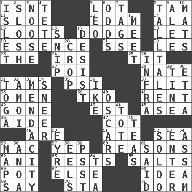 ACROSS 1. Is not 5. Car dealer's back yard 8. Scottish cap 11. _ gin 12. Dutch treat 14. In the manner of 15. Plunders 17. Evade 18. Allow 19. Core 21. Compass dir. 22. French article 23. Definite Article 24. Big collection agency 25. Teat (slang) 27. Luau course 28. Nathan's nickname 31. Scottish caps 35. 23rd letter of the Greek alphabet 37. Secret move to avoid paying debts 38. Sign of things to come 39. Ring climax 41. Monthly bill 42. Went 43. Eastern Standard Time (abbr.) 45. Toward the sea 46. Helper 47. Small bed 49. "We ___ not amused" (Victoria) 51. Had dinner 52. Ocean 55. Apple computer (short form) 57. Slangy assent 60. Thinks logically 62. Black tropical American cuckoo 63. Musical pauses 65. Table seasonings 66. Cooking vessel 67. Otherwise 68. The content of cognition 69. Declare 70. R.R. building 71. Dormintory (informal) DOWN 1. Small island 2. Splash clumsily 3. Trap for birds or small mammals 4. False hair 5. Lion 6. Probability 7. Labels 8. Baron Munchausen's specialties 9. Toward shelter 10. Floor coverings 13. Confront 16. Clip 17. Stop 20. Riding implement 26. Kind of red light 29. Prong on a fork 30. Singer James 31. Ancient Roman robe 32. Mine, in Marseilles 33. Ananias' fault 34. Contemptuous expression 36. Eisenhower's nickname 40. Motion picture awards 44. Carry 48. Afternoon social gatherings 50. Jane of fiction 52. Twentieth part of a lira 53. Keyboard key 54. Indian state 55. Atlas contents 56. Small Philippine buffalo 58. Snakelike fish 59. Inconspicuous attention getter 61. Alleged 64. Afternoon social gathering