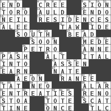 ACROSS 1. Conclude 4. Algonquian 8. The Jewish people; Israel 12. "Corrida" creature 14. Old (Scot.) 15. Inside; within (prefix) 16. Famous astronaut Armstrong 17. Dwellings 20. Toward shelter 21. The 23rd letter of the Hebrew alphabet 22. Binary compound 23. Compass direction 27. Necklace unit 29. Within a short period 31. Ancient Persian 34. Stone: prefix 35. Singer Murray 36. Romantic infatuation 39. The first octave above the treble staff 41. Slanted text style (abbr.) 42. To the inside or interior of 43. NE Netherlands city 46. Merit 47. Nathan's nickname 48. A really long time 51. Indian princess (variant) 54. Make lace 56. Modern: prefix 58. Having or resembling wings 61. Pleas 66. Western Nevada city 67. Portico 68. Carryall 69. Scram! 70. Prong on a fork 71. At one time in the past 72. Affectionate concern, for short DOWN 1. Inactive volcano in Sicily 2. Christmas carol 3. Frees from moisture 4. Automobile 5. Sorrow 6. Raised railways 7. Prepare for publication 8. Elected rep. 9. Event 10. Wrote a lyric poem 11. Characteristic smell of wine 13. Margarine 18. Small moist lump or mass 19. She-sheep 24. Purpose 25. Small child 26. Israeli folk dance 28. With great haste 30. Pitcher Ryan 32. Heredity factor (abbr.) 33. Snakelike fish 34. Give a jingle 36. Sliced dessert 37. Santa ___, CA 38. Ski resort town in Vermont 40. Russian ruler of old 44. R.R. building 45. Car or cant ending 49. Single 50. Teachers' org. 52. Hearing organs 53. Choose 54. Trial 55. Opposed to 57. "Beetle Bailey" pooch 59. Of or related to the anus 60. College mil. group 62. Actress Charlotte 63. Electrically charged atom 64. And so on (abbr.) 65. Observe
