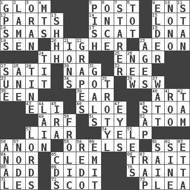 ACROSS 1. Take by theft 5. Mail 9. Followers of ems 12. Components 14. To the inside or interior of 15. Car dealer's back yard 16. Box-office sellout 17. Get outta here! 18. Heredity factor (abbr.) 19. Elected rep. 20. Having greater elevation 23. A really long time 24. Son of Odin 25. Engineer (abbr.) 27. Suttee (variant) 30. Tired old horse 32. Portuguese money of account (variant) 33. A single undivided whole 34. Blemish 36. Compass dir. 38. Car or cant ending 39. Hearing organ 40. Nonscientific branch of learning 43. Connecticut Ivy Leaguer 46. A type of plum 48. Portico 49. Sandy's bark 51. Filthy place 52. Tiny particle 53. One who doesn't tell the truth 54. Sharp bark 56. Soon (poet.) 58. Threatening words 61. Compass dir. 64. Not either 65. Clement's nick name 66. Distinguishing feature 68. Say or write further 69. "You Light Up My Life" star Conn 70. Virtuous person 71. French article 72. Highlander 73. Entreaty DOWN 1. Global Positioning Systems (abbr.) 2. Unable to walk 3. NW Algerian seaport 4. Mountains (abbr.) 5. Expression of disdain 6. At one time in the past 7. A viewer who gazes fixedly 8. Small child 9. A person who is older than you are 10. Words to Nanette 11. Comedian Laurel of Laurel & Hardy 13. Quiet! 21. Charged particles 22. Raisin fruits 23. Eons 24. Teat (slang) 26. ___ Haven, CT 27. Institute legal proceedings 28. A saturated hydrocarbon 29. Prong on a fork 31. Purposes of endeavors 35. TNT 37. Electrical Unit 41. Friend of Pooh 42. Scottish cap 44. (Had) reclined 45. Retirement account (abbr.) 47. Sight organs 48. Plant excrement 50. Romp 53. Domineers 55. Allows 56. Of or related to the anus 57. Connecting point 59. Do over again 60. Give off 61. Travel by water 62. Trig term 63. Singer James 65. Music discs 67. Reproach for some lapse or misdeed