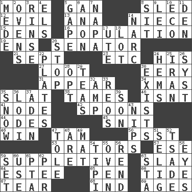 ACROSS 1. Greater amount 5. Separate the seeds from cotton 8. Downhill vehicle 12. Morally bad or wrong 13. Santa ___, CA 14. Sibling's daughter 15. Cub Scout units 16. Census information 19. Followers of ems 20. Legislator 21. Back-to-school mo. 23. And so on (abbr.) 24. Part of HMS, perhaps 27. Spoils 30. Suggestive of the supernatural 31. Seem 34. Dec. holiday 35. Narrow board 38. Softens 40. Is not 41. Connecting point 42. Soup utensils 44. Lyric poems 45. In a ____ (agitated or irritated) 46. Acquire through effort 47. Scottish cap 50. Inconspicuous attention getter 53. Speakers 57. Compass dir. 59. Supplying deficiencies 63. Kill 64. First name in cosmetics 65. Animal enclosure 66. Periodic rise and fall of the sea level 67. Pull apart 68. Indiana (abbr.) 69. Eons DOWN 1. Ancient Persian 2. Baking chambers 3. Remove soap 4. Raised railways 5. Open wide 6. At once, immediately (arch.) 7. California wine valley 8. Be seated 9. Flowery wreath 10. Environmental prefix 11. Lair 14. Drug cop 17. Shoshoni 18. Car dealer's back yard 20. Obstruct or block passage 22. Food holders 24. Folds over and sews together 25. SW Asia republic 26. System (abbr.) 28. Elect 29. Beverages made from leaves 30. Has an existence 32. Electrical Unit 33. Vintage cars 35. Frozen precipitation 36. Farming town in central California 37. Arabian gulf 39. Boy, to dad 43. Pinches, bites 47. Lacquered or enameled metalware 48. "We ___ not amused" (Victoria) 49. Floor protector 51. Former Milwaukee Brewers owner Bud 52. Sadhe (variant) 54. Native american tent (variation) 55. Baking chamber 56. Tear apart 58. Snake ____ (dice throw) 59. Put into a specified state 60. Purpose 61. Parent Teacher Association (abbr.) 62. For each 63. R.R. building