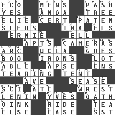 ACROSS 1. Environmental prefix 4. Not women's 8. Romantic infatuation 12. It is so 13. Small Philippine buffalo 14. Woody plant 15. Writer Wiesel 17. Foregone conclusion 18. Eucharist need 19. Bobsleighs 21. _ tizzy (2 wds.) 23. Raised railways 24. Bert's buddy 26. Pipe bend 28. Flats, for short 30. Devices for capturing images 34. Curve 37. Southern CA. univ. 39. Travels 40. Surprise greeting 41. Removes the wrinkles 43. Car dealer's back yard 44. Competent 46. Domed church section 47. Followers of ems 48. Pulling apart 51. Portable shelter 54. "___ Maria" 55. Gospel singer Marvin 58. _-fi 61. Had dinner 63. Take or capture by force 65. Soviet premier 1918-24 67. Jacques Cousteau's middle name 71. Pledge 72. Pig sound 73. Travel on an animal 74. Afternoon social gathering 75. Otherwise 76. Comfort 77. Fast jet (abbr.) DOWN 1. Snake ____ (dice throw) 2. Cell (Danish) 3. Flexible twig of a willow tree 4. Big _ 5. Compass dir. 6. And not 7. Suttee (variant) 8. Parent Teacher Association (abbr.) 9. Johnson of "Laugh-In" 10. Stitch closed the eyes of (a falcon) 11. Coop moms 16. Pulitzer Prize-winning author Ferber 18. Inside of hand 20. Small drink 22. Teachers' org. 25. Needle holder 27. Part of a journey 29. Strangle with an iron collar 30. 2nd pers. sing. pres. of can (arch.) 31. Hero or heavy, e.g. 32. A really long time 33. Fast planes 34. Blind as ____ 35. Loose flowing garment 36. Root beer relative 38. Chop off 42. Perceives with the eye 45. Period 49. "Terrible" tsar 50. Remaining after all deductions 52. ___ Haven, CT 53. Pacific island yam 56. Theater features 57. _____ Park, CO 58. A type of plum 59. To provide with a ceiling 60. Taverns 62. Jane of fiction 64. Not this but _ 66. Mamie's husband 68. By way of 69. Begley and Asner 70. Perceive with the eye