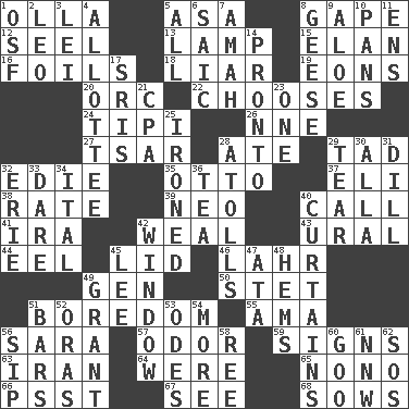 ACROSS 1. Spanish pot 5. White ___ sheet 8. Open wide 12. Stitch closed the eyes of (a falcon) 13. Desk light 15. Liveliness 16. Fencing necessities 18. One who doesn't tell the truth 19. Immeasurably long periods of time 20. The grampus (Milton) 22. Opts 24. Native american tent (variation) 26. Compass dir. 27. Russian ruler of old 28. Had dinner 29. Small amount or degree 32. Singer Brickell 35. "Beetle Bailey" pooch 37. Biblical high priest 38. Assign a rank or rating to 39. Modern: prefix 40. Give a ring to 41. Retirement account (abbr.) 42. Welt 43. Mountain range 44. Snakelike fish 45. Hat (slang) 46. Cowardly lion portrayer 49. Commissioned mil. rank 50. Proofreading order 51. Mood resulting from idleness 55. Nursemaid (var.) 56. "Two Mules for Sister ____" 57. Scent 59. Public displays of written messages 63. SW Asia republic 64. Past tense of be (plural) 65. Words to Nanette 66. Inconspicuous attention getter 67. Observe 68. Sty mamas DOWN 1. Order of Saint Francis (abbr.) 2. Lion 3. Flowery wreath 4. One to whom something is allotted 5. Everything 6. Ketch in the Levant 7. Wet nurse 8. Honkers 9. _ vera 10. Zero-star reviews 11. Followers of ems 14. Right away 17. Indian titles of respect 21. Numbers guy (abbr.) 23. Single 25. Pressed 28. Ringlike coral islands and reefs 29. Rend 30. Silent film actress Nazimova 31. Deli pickle 32. One of the Great Lakes 33. Have the gumption 34. Slanted text style (abbr.) 36. Beverage made from leaves 40. Window treatments 42. Light entry point 45. Area sheltered from the wind 47. "One Day ___ Time" 48. Folds over and sews together 49. Let have 51. Long, evenly shaped pieces 52. Mouths or openings 53. Lyric poems 54. Greater amount 56. Small drink 58. To sift 60. Thick or sticky substance 61. Compass dir. 62. Mayday
