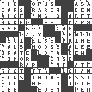 ACROSS 1. Definite Article 4. Musical composition 8. White ___ sheet 11. Hearing organs 13. More valued for its uncommonness 15. Benjamin's nick name 16. Medicinal plant 17. White American of non-Hispanic descent 18. Collude with 19. Cowboy competition 21. Lizard (obsolete) 22. Atlas contents 23. Compass dir. 24. Gift holder 27. Head covering 29. American folk hero Crockett 30. Sir (Sp.) 34. _-fi 36. Otherwise 39. First class 40. Friends 41. Trap for birds or small mammals 43. Toward shelter 44. Speak pompously 46. Globular water bottle used in Asia 47. Commissioned military rank (abbr.) 48. The easternmost of the Lesser Sundas 49. Celtic language 51. Strike 53. Compass dir. 54. Had dinner 57. Native of Scotland 60. ___ a Wonderful Life 63. Pitcher Ryan 65. Immeasurably long periods of time 66. Collection of objects 69. Inconspicuous attention getter 70. And so on (abbr.) 71. Sun: prefix 72. Haul 73. Area sheltered from the wind 74. Genesis locale 75. For each DOWN 1. Pulls apart 2. Auras 3. Eat (away) 4. Mouth or opening 5. Baking dish 6. Goad 7. Oneself 8. Swedish rock group 9. Ooze 10. Pismires 12. Perceive with the eye 14. College mil. group 18. Electrical Measurement 20. Chief or king in Benin or Nigeria 25. Baking chamber 26. Xylene (variant) 28. Cleo's killer 29. What propaganda does 31. Mediterranean tributary 32. Presage 33. To sift 34. Indian skirt 35. Dollar (slang) 37. "Barney Miller" actor Jack 38. First name in cosmetics 40. Cooking vessel 42. Merit 45. Epoch 50. Elected rep. 52. Heart or essence 54. Columnist Joseph or Stewart 55. Clothes sense 56. Keyboard key 57. Sew up the eyelids of hawks and falcons 58. ____ d'Azur (French Riviera) 59. At one time in the past 61. Relationship diagram 62. Disposed of to a purchaser 64. Choose 67. Compete 68. Period of immesurable duration