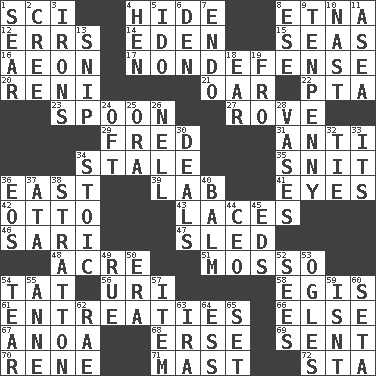 ACROSS 1. _-fi 4. Flintstone garb 8. Inactive volcano in Sicily 12. Blunders 14. Locale of original sin 15. Oceans 16. Period of immesurable duration 17. Unrelated to defense, as in spending 20. Painter Guido (1575-1642) 21. Boat paddle 22. Parent Teacher Assoc. 23. Soup utensil 27. Be footloose 29. Flintstone 31. Opposed to 34. Lacking originality or spontaneity 35. In a ____ (agitated or irritated) 36. Compass direction 39. Experiment locale 41. Snake ____ (dice throw) 42. "Beetle Bailey" pooch 43. Shoestrings 46. Indian skirt 47. Downhill vehicle 48. 43,560 square feet 51. With motion or animation 54. Make lace 56. RI univ. 58. Armor plate that protects the chest 61. Pleas 66. Otherwise 67. Small Philippine buffalo 68. Celtic language 69. Posted 70. French philosopher Descartes 71. Vertical spar for supporting sails 72. R.R. building DOWN 1. Dry up 2. Algonquian 3. Removes the wrinkles 4. Layer 5. Wedding promise 6. Lair 7. Inside; within (prefix) 8. Compass dir. 9. 3-inch nail 10. Political cartoonist Thomas 11. Toward the sea 13. Clip 18. Ewer handle 19. Away 24. Often (poetically) 25. Mouth or opening 26. 1994 drama film starring Jodie Foster 28. Flower holders 30. Allots cards 32. Standoff 33. It is 34. Unemotional 36. Greek goddess of the dawn 37. "One Day ___ Time" 38. Ski resort town in Vermont 40. Lip ointment 44. Corporate head (abbr.) 45. Begley and Asner 49. Sorrow 50. Period 52. Observes 53. Stares at amorously 54. Rend 55. Queen of England 1702-14 57. A whole individual unit 59. Is not 60. Stalk of a moss capsule 62. Actress Charlotte 63. Retirement account (abbr.) 64. Double-curved letter 65. Arrange properly for use