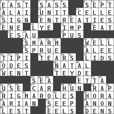 ACROSS 1. 90 degrees 5. Backtalk 9. Back-to-school mo. 13. Jai ____ 14. A single undivided whole 15. Cell (Danish) 16. Omen 17. Pleas 19. Compass dir. 20. Potassium hydroxide 21. Naughty child 22. Ingest 23. He sold his birthright 25. Product of festering 26. Excessive but superficial compliments 30. Water source 34. Upset 35. Toward shelter 36. Native american tent (variation) 39. Rends 42. Flaplike coverings 43. Lyric poems 44. Brizilian seaport 46. Left 47. Miss Universe 1986, Barbara Palacios _ 48. Ocean 51. Singer James 54. Purpose 57. Automobile 58. Attila the _ 60. Strike 62. Complicated, petty procedures 65. Israeli folk dance 66. Believer in; advocate of (suffix) 67. Ooze 68. At once, immediately (arch.) 69. For fear that 70. Snakelike fish 71. Hiding places for outlaws DOWN 1. Comfort 2. Place in a line 3. Gurus 4. Shallow baking pan 5. Chop _ 6. Singer Murray 7. Be seated 8. Long narrow piece of something 9. Arrange properly for use 10. Writer Wiesel 11. Entreaty 12. Trial 15. Balmoral and tarboosh 18. Australian flightless bird 20. Mass 24. Help 27. Nonscientific branch of learning 28. Regret 29. Intended 30. Place for singles 31. Connecticut Ivy Leaguer 32. Directed 33. French article 36. Pull behind 37. Binary compound 38. Animal enclosure 40. Actress Charlotte 41. Filthy place 45. An important port of Yemen 48. Skim 49. Hearing organ 50. Came up 52. Heavy duty weighing machine 53. Composer Copland 54. Mountain range 55. Father 56. Armor plate that protects the chest 58. The bottom of a shoe or boot 59. United States Postal Service (abbr.) 61. Zero-star reviews 63. Floor protector 64. Area sheltered from the wind 65. Possessed