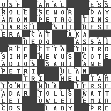 ACROSS 1. Order of Saint Francis (abbr.) 4. Of or related to the anus 8. Curvy letter 11. Hero or heavy, e.g. 13. Sir (Sp.) 15. 24 hours 16. At once, immediately (arch.) 17. Stone: prefix 18. Metal containers 19. Tarsus (plural) 21. Be seated 22. Relief 23. Period 24. Domesticated feline 27. Alias (abbr.) 29. Make new 30. Slender Brazilian palm 34. To separate or throw off 36. Singer James 39. One of three equal parts 40. Simple or foolish person 41. Mole, birthmark 43. ____ d'Azur (French Riviera) 44. Goodbye (Sp.) 46. Indian skirt 47. One (Scot) 48. _ dish (used to culture cells) 49. Uhlan (variant) 51. Three (prefix) 53. Cartoonist voice _ Blanc 54. Scottish cap 57. Heavy book 60. Basketball assoc. 63. Laconic 65. The sixth month of the Jewish calendar 66. For Whom the Bell _____ 69. Electrical Unit 70. Allow 71. A small or young owl 72. Independent ruler or chieftain 73. Music discs 74. Kenny Rogers chart-topper in '80 75. Before (prefix) DOWN 1. Declaim 2. Echolocation 3. Plants 4. Viper 5. Born 6. Pismires 7. Australian parrot (variant) 8. Singer Brickell 9. Without 10. System (abbr.) 12. Followers of ems 14. Roll call or roster of names 18. File 13 20. Frozen water 25. An important port of Yemen 26. Hauls 28. Krazy ___ of comics 29. Newsperson 31. The Jewish people; Israel 32. Johnson of "Laugh-In" 33. Binary compound 34. Travel on an animal 35. Send forth 37. Federal power corp. 38. Gold (Symbol: Au) 40. Plant excrement 42. Filth; sediment 45. Title for a knight 50. Keyboard modifier key 52. To the inside or interior of 54. _____ steamer (cargo ship) 55. Moving about 56. Distance measurement (Brit.) 57. Baby powder 58. Wrote a lyric poem 59. Floor protectors 61. Soup holder 62. Silent film actress Nazimova 64. She-sheep 67. Directed 68. Filthy place