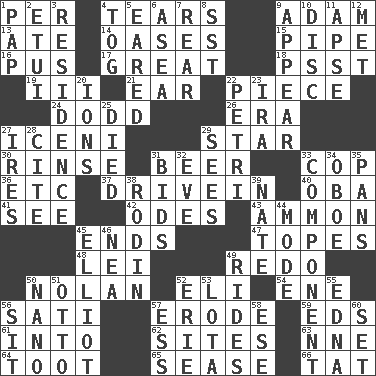 ACROSS 1. For each 4. Lacerates 9. First of billions? 13. Had dinner 14. Fertile tracts in a desert 15. Corncob 16. Fluid product of inflammation 17. Relatively large 18. Inconspicuous attention getter 19. One more than two 21. Hearing organ 22. Part 24. Texas town _ City 26. Period 27. Ancient Celtic tribe of eastern Britain 29. Play the lead 30. Wash lightly 31. Fermented drink made from hops 33. Police officer (slang) 36. And so on (abbr.) 37. Popular '50s hangout 40. Chief or king in Benin or Nigeria 41. Perceive with the eye 42. Lyric poems 43. ID or VA city 45. Conclusions 47. Drinks excessively 48. Flowery wreath 49. Do over again 50. Pitcher Ryan 52. Biblical high priest 54. Compass dir. 56. Suttee (variant) 57. Eat (away) 59. Begley and Asner 61. To the inside or interior of 62. Settings 63. Compass dir. 64. A blast of a horn 65. Gospel singer Marvin 66. Make lace DOWN 1. Infant food 2. Needle case 3. Home 4. Coat; cloak 5. Having ears or earlike features 6. At sea 7. Hitchcock's "____ Window" 8. Fast jet (abbr.) 9. Seem 10. Plate 11. Domed church section 12. Was introduced to 20. Charged atoms 22. _ dish (used to culture cells) 23. Retirement account (abbr.) 25. Passed on 27. Angers 28. Quote 29. Observes 31. Auction offers 32. First lady 33. Piece 34. Mitch Miller's instrument 35. Baking dishes 38. "The Thinker" sculptor 39. Nathan's nickname 44. Method 45. American author Paul (1891-1958) 46. Teachers' org. 49. Amusement-park features 50. Billionth: prefix 51. Von Bismarck 52. One of the Great Lakes 53. Globular water bottle used in Asia 55. Pulitzer Prize-winning author Ferber 56. Be seated 57. Double-curved letter 58. Compass dir. 60. Put into a specified state