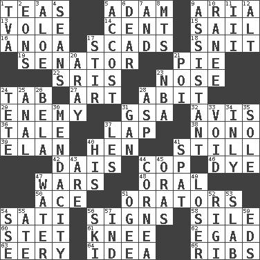 ACROSS 1. Afternoon social gatherings 5. First of billions? 9. Operatic vocal solo 13. Grand slam 14. Penny 15. Travel by water 16. Small Philippine buffalo 17. Loads 18. In a ____ (agitated or irritated) 19. Legislator 21. Sliced dessert 22. Indian titles of respect 23. Olfactory organ 24. Bar bill 27. Nonscientific branch of learning 28. "This won't hurt ____!" 29. Foe 31. Girls' org. (abbr.) 32. Deliberation 36. Falsehood 37. Infant locale 38. Words to Nanette 39. Liveliness 40. Layer 41. Free of sound 42. Raised platform 44. Police officer (slang) 46. Color 47. Armed conflicts 48. Of the mouth 50. Adept person 51. Speakers 54. Suttee (variant) 56. Signals 58. Filth; sediment 60. Proofreading order 61. Leg joint 62. Mild oath 63. Suggestive of the supernatural 64. It may be bright or harebrained 65. Chest bones DOWN 1. Federal power corp. 2. Immeasurably long periods of time 3. _ vera 4. Seines 5. Buttonhole 6. Letter starter 7. Added to 8. Mountains (abbr.) 9. Aide 10. Indian princess (variant) 11. One more than two 12. The first octave above the treble staff 17. Use a swizzle stick 20. Like ___ of sunshine 21. Luau course 23. Basketball assoc. 24. False hair 25. Of or related to the anus 26. Actor Lugosi 28. Viper 30. Ananias' fault 31. Separate the seeds from cotton 33. Null 34. In an inward manner 35. Flatfish 37. French article 40. Part of HMS, perhaps 41. Petty quarrel 43. "We ___ not amused" (Victoria) 44. Pupil covering 45. Mouths or openings 47. Wetness 49. Failure 51. Double curve, resembling the letter S 52. Swiss mountan, "Queen of the Mountains" 53. Broad, flat, thick piece 54. Compass dir. 55. Had dinner 56. What Jean-Claude Killy likes to do 57. Indiana (abbr.) 59. Begley and Asner