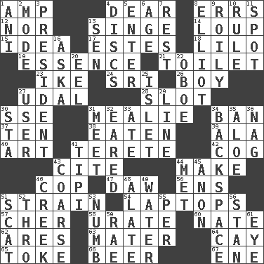 ACROSS 1. Electrical Unit 4. Letter starter 8. Blunders 12. Not either 13. Burn superficially 14. Central Nebraska county 15. It may be bright or harebrained 17. _____ Park, CO 18. _ and Stitch 19. Center 21. Rest room 23. Mamie's mate 24. Indian title of respect (Mr.) 26. Male child 27. Freehold land 28. Position in a hierarchy or organization 30. Compass dir. 31. Ear of corn 34. Bar 37. Nine, plus one 38. Ingested 39. Insect wing 40. Nonscientific branch of learning 41. Cylindrical with tapered ends 42. Gear tooth 43. Quote 44. Cause to be 46. Police officer (slang) 47. Fool 50. Followers of ems 51. Put through a sieve 54. Portable computers 57. "Mermaids" star 58. A salt of uric acid 60. Nathan's nickname 62. Ancient Greek god of war 63. Mother 64. Island 65. Casino tip 66. Fermented drink made from hops 67. Compass dir. DOWN 1. Cuckoo 2. Method 3. Elected leader of a country 4. Plates 5. Keyboard key 6. Personal question 7. Relief 8. American author Paul (1891-1958) 9. Turbulent 10. Governing power 11. Blemish 13. Elected rep. 16. "____ silly question..." 20. Snakelike fish 22. Mitch Miller's instrument 25. Small island 27. One who uses or employs something 29. Actor's bit 30. R.R. building 31. Rendezvous 32. Having ears or earlike features 33. Had dinner 34. Keyboard key 35. Medicinal plant 36. Tired old horse 41. Native american tent (variation) 43. Unrefined 44. Was introduced to 45. At once, immediately (arch.) 46. Small stream 48. Having winglike extensions 49. Wetness 51. Jazz singing style 52. Through, poetically 53. Unfeeling 55. For each 56. Comedian Laurel of Laurel & Hardy 59. Actress Charlotte 61. Sight organ