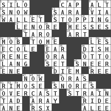 ACROSS 1. Grain storage tower 5. Head covering 8. Keyboard modifier key 11. Frozen precipitation 12. "Two Mules for Sister ____" 13. By way of 14. Place for singles 17. Halting 19. Poe poem 21. Makes clutter 22. Edible starchy tuberous root 23. Tate display 24. Crowd into 27. Heavy book 29. French article 32. Learning spot: Fr. 34. Hearing organ 36. Food container 37. French philosopher Descartes 38. Mouth or opening 39. Von Bismarck 40. Long (Scottish) 41. Arrange properly for use 42. Scornful expression 43. Compass dir. 44. South Vietnam president (1954) 46. Portuguese money of account (variant) 47. Immediately 50. Mouths or openings 52. Full of chinks, cracks, or crevices 55. Sounds asleep 57. Cloudy 59. Put through a sieve 62. Bit 63. Like ___ of sunshine 64. Travel on an animal 65. A saturated hydrocarbon 66. Acura sports coupe 67. Toward shelter DOWN 1. Compass dir. 2. _ tizzy (2 wds.) 3. Hang loosely or laxly 4. A small or young owl 5. Domesticated feline 6. Odor 7. Some stationery 8. Deliberation 9. Actor's bit 10. Labels 12. Compass dir. 15. Related on the mother's side 16. "Corrida" creature 18. Pacific Standard Time (abbr.) 20. Lover boys 24. Haggard of country music 25. Sea 26. Child's nurse 28. Having ears or earlike features 29. 61 cubic inches 30. First name in cosmetics 31. Dinah or Pauly 33. Part of a journey 35. Food allowance for one day 36. Spanish title 42. Don Adams' spy role 45. Greek god of love 47. Not either 48. Witty Wilde 49. Erodes 51. Spanish missionary in California 52. Roll call or roster of names 53. _ the terrible 54. Ancient Persian 55. Filthy place 56. Travel by water 58. Saxophone 60. Binary compound 61. Born