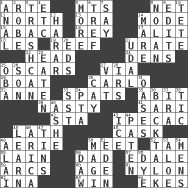 ACROSS 1. Johnson of "Laugh-In" 5. Mountains (abbr.) 8. Remaining after all deductions 11. 0 degrees 13. Mouth or opening 14. Method 15. Phillipine bananalike plant 16. Marina Del _, California 17. Came down and settled, as after flight 18. French article 19. Coral ridge 21. A salt of uric acid 22. Froth on beer 24. Lairs 25. Motion picture awards 27. By way of 29. Water vessel 30. Monte _, Las Vegas Hotel/Casino 32. Singer Murray 33. Arguments over trivial matters 35. "This won't hurt ____!" 39. Thoroughly unpleasant 41. Indian skirt 42. R.R. building 43. Medicinal drug used to evoke vomiting 45. Thin strip of wood or metal 48. Keg 49. Nest on high 50. Confront 52. Scottish cap 55. (Had) reclined 56. Male parent 57. Peak District village in England 59. Arches 60. Grow older 61. High-strength synthetic material 62. _ tizzy (2 wds.) 63. Acquire through effort 64. Supplements with great effort DOWN 1. Of or related to the anus 2. Loose flowing garment 3. File 13 4. And so on (abbr.) 5. Greater amount 6. Not kosher 7. Declare 8. Pitcher Ryan 9. Proofreads 10. False hair 12. Ethiopian city, capital of Harari 14. Female horse 20. Begley and Asner 21. Allodial 23. Consumed 25. Chief or king in Benin or Nigeria 26. Boy, to dad 27. Large container 28. Big collection agency 30. Island 31. Fertile tracts in a desert 33. Fast jet (abbr.) 34. Parent Teacher Assoc. 36. Sass 37. Retirement account (abbr.) 38. Nervous spasm 40. American tennis player Robert 43. Frozen water 44. Eucharist need 45. Memorize 46. N. Chile seaport 47. Metal containers 49. Mountain range southwest of Kyrgyzstan 50. Wise men 51. Paradise 53. Medicinal plant 54. Not women's 56. Simpleton 58. Color