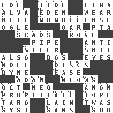 ACROSS 1. Enemy 4. Event that recurs at intervals 8. Inactive volcano in Sicily 12. Inventor's middle name 14. Paradise 15. Put on (as clothing) 16. Famous astronaut Armstrong 17. Unrelated to defense, as in spending 20. Stare 21. Boat paddle 22. Parent Teacher Association (abbr.) 23. Tons 27. Be footloose 29. Corncob 31. Against 34. Bull 35. In a ____ (agitated or irritated) 36. In addition 39. Two (Sp.) 41. Sight organs 42. Christmas carol 43. Flat circles 46. Centimeter-gram-second unit of force 47. Comfort 48. First of billions? 51. Catcalls? 54. Sep. follower 56. Modern: prefix 58. At once, immediately (arch.) 61. Appease 66. Drink excessively 67. Edible starchy tuberous root 68. (Had) reclined 69. It was, poetically 70. System (abbr.) 71. Without 72. Quiet! DOWN 1. Papal veil 2. Cassini of fashion 3. Vices 4. Nine, plus one 5. Wedding promise 6. Lair 7. Inside; within (prefix) 8. She-sheep 9. 3-inch nail 10. Political cartoonist Thomas 11. Length times width 13. Actor Baldwin 18. Ewer handle 19. Away 24. Fitting 25. Pass on 26. Hurried 28. Flower holders 30. Wear away 32. Standoff 33. It is 34. Having a sole or soles 36. Plus 37. Myrna of the movies 38. Elected representatives 40. Thailand, formerly 44. Compass dir. 45. Corporate head (abbr.) 49. Cuckoo 50. Was introduced to 52. Electrical Unit 53. Overwhelms 54. Elects 55. Supercomputer manufacturer 57. Petroleums 59. Brightly colored fish 60. Soft 62. Cooking vessel 63. Auto club (abbr.) 64. Metal container 65. Followers of ems