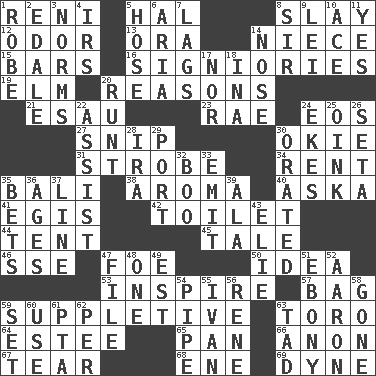 ACROSS 1. Painter Guido (1575-1642) 5. Actor Linden 8. Kill 12. Aroma 13. Mouth or opening 14. Sibling's daughter 15. Drinking establishments 16. Seigniories (variant) 19. Shade tree 20. Thinks logically 21. He sold his birthright 23. Actress Charlotte 24. Greek goddess of the dawn 27. Clip 30. Migrant worker of the '30s 31. Disco prop 34. Monthly bill 35. Indonesian resort city 38. Odor 40. "____ silly question..." 41. The front part of a cuirass 42. Bathroom 44. Portable shelter 45. Story 46. Compass dir. 47. Enemy 50. It may be bright or harebrained 53. Stimulate to action 57. Paper or plastic container 59. Supplementary 63. "Corrida" creature 64. First name in cosmetics 65. Baking dish 66. Soon (poet.) 67. Rend 68. Compass dir. 69. Unit of force DOWN 1. Loose flowing garment 2. Peak District village in England 3. Typical standards 4. Big collection agency 5. Stockings 6. Operatic vocal solo 7. Fails to keep up a pace 8. Title for a knight 9. Flowery wreath 10. Adept person 11. It is so 14. Olfactory organ 17. And not 18. _ tizzy (2 wds.) 20. The smallest animal of a litter 22. Aid 24. Makes supply last 25. Pig sound 26. Bristle 28. Retirement account (abbr.) 29. Left side of a ship or aircraft 30. Spoke pompously 32. Oct. 31 cry 33. Send forth 35. Antes 36. Ripens 37. Actor's bit 39. In the manner of 43. Writer Wiesel 47. Do some clerical work 48. Single 49. Eastern Standard Time (abbr.) 51. Dark wood 52. Composer Copland 54. Corncob 55. "Terrible" tsar 56. French philosopher Descartes 58. Went 59. Put into a specified state 60. Purpose 61. Parent Teacher Association (abbr.) 62. For each 63. Bit