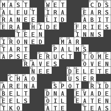 ACROSS 1. Vertical spar for supporting sails 5. Dripping 8. Music discs 11. Eskimo relative 13. Retirement account (abbr.) 14. Hearing organs 15. Indian princess (variant) 16. Flaplike covering 17. "This won't hurt ____!" 18. Epoch 19. Flintstone garb 21. Strips of potato fried in deep fat 22. Adolescent 24. Taverns 25. Pressed 27. Spoil 29. Small pie 30. Insides of hands 32. Domed church section 33. Spew [out] 35. Heavy book 39. All-night dance parties 41. Baking chamber 42. Born 43. Erase 45. US Secretary of Labor Elaine L. _ 48. One who makes use of a thing 49. Sports stadium 50. Specific locale 52. To free from 55. Waist strap 56. Heredity factor (abbr.) 57. Dodge 59. Snakelike fish 60. Lubricate 61. Eroded 62. Ring climax 63. Had dinner 64. Beverages made from leaves DOWN 1. Female horse 2. Having or resembling wings 3. Legislators 4. Third day of the wk. 5. Rampant 6. 4th largest of the Great Lakes 7. Bit 8. Apartment or room in a ship 9. Frees from moisture 10. Fast planes 12. Giggle 14. Merit 20. Indiana (abbr.) 21. Become taut 23. Keyboard key 25. Call ___ day 26. Reproach for some lapse or misdeed 27. Apple computer (short form) 28. The first octave above the treble staff 30. Product of festering 31. Fur scarf 33. First lady 34. To sift 36. Make much ado about nothing 37. Was introduced to 38. Compass dir. 40. Small Philippine buffalo 43. Superhero pair 44. First name in cosmetics 45. Small stream 46. Phone greeting 47. Pismires 49. Collude with 50. In a ____ (agitated or irritated) 51. Diluted with white 53. It may be bright or harebrained 54. Hiding places for outlaws 56. ___ good deed 58. Large container