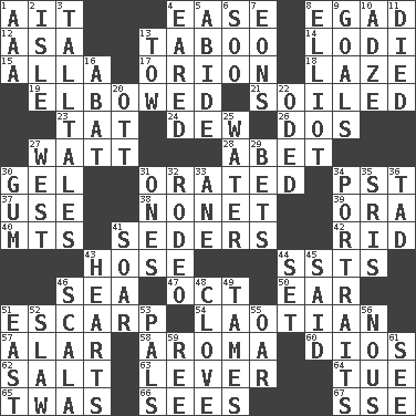 ACROSS 1. Small island 4. Comfort 8. Mild oath 12. White ___ sheet 13. Off limits 14. Farming town in central California 15. Silent film actress Nazimova 17. Constellation of myth 18. Goldbrick 19. Turned at an angle; bent 21. Dirtied 23. Make lace 24. Morning condensation 26. Two (Sp.) 27. Electrical Unit 28. Collude with 30. Set 31. Spoke pompously 34. Pacific Standard Time (abbr.) 37. Purpose 38. Music written for nine 39. Mouth or opening 40. Mountains (abbr.) 41. Spring feasts 42. To free from 43. Stockings 44. Fast planes 46. Ocean 47. Sep. follower 50. Hearing organ 51. Fortification 54. Of or relating to Laos or its people 57. Having or resembling wings 58. Scent 60. "Vaya con ____" 62. Table seasoning 63. Crowbar 64. Third day of the wk. 65. It was, poetically 66. Perceives with the eye 67. Compass dir. DOWN 1. Auto club (abbr.) 2. Small island 3. Baron Munchausen's specialties 4. Having ears or earlike features 5. Tolerate 6. "Barney Miller" actor Jack 7. Immeasurably long periods of time 8. American author Paul (1891-1958) 9. Scores awarded for successful feats 10. Axlike tool, used for shaping wood 11. Passed on 13. Pull behind 16. Blind as ____ 20. Baseball player Mel 22. Wrote a lyric poem 25. Wetness 27. 270 degrees 29. Stakes 30. Chewing product 31. Singles 32. Cowboy competition 33. One (Scot) 34. Likenesses of persons 35. Indian titles of respect 36. Small amount or degree 41. Fly high 43. Centers 44. Put into a specified state 45. Expressed in words 46. Any of the three canals of the cochlea 48. Garlic unit 49. Corrects by punishment or discipline 51. Compass direction 52. Cole _ (cabbage dish) 53. Friends 55. Rowing implement 56. Good sense 59. To sift 61. Observe