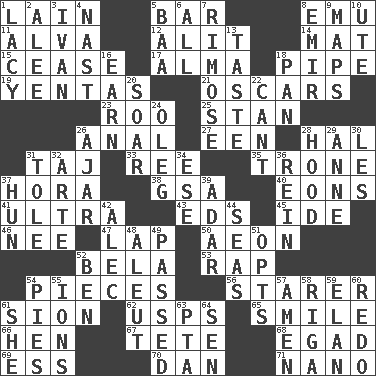 ACROSS 1. (Had) reclined 5. Drinking establishment 8. Australian flightless bird 11. Inventor's middle name 12. Set down 14. Floor covering 15. Desist 17. _ mater 18. Corncob 19. Gossips 21. Motion picture awards 23. Friend of Pooh 25. Comedian Laurel of Laurel & Hardy 26. Of or related to the anus 27. Car or cant ending 28. Actor Linden 31. _ Mahal 33. Portuguese money of account (variant) 35. Heavy duty weighing machine 37. Israeli folk dance 38. Girls' org. (abbr.) 40. Immeasurably long periods of time 41. Extremist 43. Begley and Asner 45. Binary compound 46. Born 47. Infant locale 50. A really long time 52. Actor Lugosi 53. Reproach for some lapse or misdeed 54. Components 56. A viewer who gazes fixedly 61. The Jewish people; Israel 62. United States Postal Service (abbr.) 65. Grin 66. Layer 67. False hair 68. Mild oath 69. Double-curved letter 70. One of the 12 tribes of Israel 71. Billionth: prefix DOWN 1. Made of lace 2. Toward shelter 3. _ the terrible 4. Political cartoonist Thomas 5. Sound made by sheep 6. 100% 7. Full of chinks, cracks, or crevices 8. Arab leader 9. Atlas contents 10. Shoshoni 13. Clothes sense 16. Merit 18. Baking dish 20. Fly high 22. Patter 24. Cassini of fashion 26. Partly open 28. Parka part 29. Queen of England 1702-14 30. French article 31. Lacquered or enameled metalware 32. Johnson of "Laugh-In" 34. Compass dir. 36. It's straight from the horse's mouth 37. Attila the _ 39. The sixth month of the Jewish calendar 42. Actor Baldwin 44. Oceans 48. Native American of Southwest Alaska 49. Went by 51. Chooses 52. Benjamin's nick name 54. Sliced desserts 55. Charged particles 57. So be it 58. Port city in Latvia 59. Enthusiasm 60. Make new 61. A female animal or person 63. Parent Teacher Association (abbr.) 64. Elected rep.