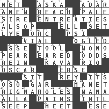 ACROSS 1. Fish or hair follower 4. "____ silly question..." 8. The sixth month of the Jewish calendar 12. So be it 14. Arrive at 16. Diluted with white 17. Father 18. Pleas 20. Columnist Joseph or Stewart 22. Pipe bend 23. Arrange properly for use 24. Potassium hydroxide 25. The grampus (Milton) 28. 23rd letter of the Greek alphabet 30. Small bottle 31. Stared at amorously 35. Compass dir. 37. Implement 40. Words to Nanette 41. Lightbulb-shaped fruit 42. Having ears or earlike features 44. Likelihood 45. It's straight from the horse's mouth 46. Polynesian shrub of the pepper family 47. _ de Janeiro 48. Motion picture award 50. Celtic language 52. Be seated 54. Marina Del _, California 55. It is 58. Bear (Spanish) 61. Slender fish 63. French painter Edouard 65. Frustrating wastes of time 70. Grandmother 71. Silent film actress Nazimova 72. Aches 73. International (abbr.) 74. Ooze 75. Confront 76. Compass dir. DOWN 1. Rhinal 2. Poet Dickinson 3. Laconic 4. "We ___ not amused" (Victoria) 5. Elected rep. 6. Krazy ___ of comics 7. Land measure 8. Fitting 9. Raised platform 10. Toward shelter 11. Respite 13. Modern: prefix 15. Aid 19. In addition 21. Luau course 26. Assign a rank or rating to 27. Anything that covers or conceals 29. Dismiss 30. Actresses Bloom and Felton 32. Farming town in central California 33. Inside; within (prefix) 34. Two (Sp.) 35. Perceives with the eye 36. Ketch in the Levant 38. Mouth or opening 39. Crowbar 41. Adept person 43. Have the gumption 49. Port city in Latvia 51. Symbol (abbr.) 53. Canvas cover 55. Empty; void 56. Portable shelters 57. Lacking originality or spontaneity 58. Mouths or openings 59. Filth; sediment 60. Stare 62. Wander aimlessly 64. Cuckoo 66. Atlas unit 67. Falsehood 68. Compass dir. 69. Fast jet (abbr.)