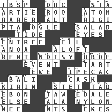 ACROSS 1. Cook's measure (abbr.) 5. The grampus (Milton) 8. R.R. building 11. Nick name for Arthur 13. Friend of Pooh 14. Smallest unit of an element 15. More uncommon 16. Keyboard modifier key 17. Swiss mountan, "Queen of the Mountains" 18. Parent Teacher Assoc. 19. Stare 21. First course 22. Periodic rise and fall of the sea level 24. Sight organs 25. Main course 27. Pipe bend 29. Small Philippine buffalo 30. High up in or into the air 32. Monthly bill 33. Annoyingly loud 35. Mitch Miller's instrument 39. Happening 41. Small pie 42. She-sheep 43. Medicinal drug used to evoke vomiting 45. Indonesian resort city 48. Keg 49. Japanese brewing company 50. Proofreading order 52. Small amount or degree 55. Inky black, to poets 56. The 23rd letter of the Hebrew alphabet 57. Peak District village in England 59. Otherwise 60. Wing 61. High-strength synthetic material 62. Born 63. Mountains (abbr.) 64. Supplements with great effort DOWN 1. Canvas cover 2. Naughty child 3. Ski resort town in Vermont 4. Sliced dessert 5. Taken by mouth 6. Hero or heavy, e.g. 7. Small bed 8. Vertical member of a panel or frame 9. Ancient Roman robes 10. Among 12. Eat (away) 14. Like ___ of sunshine 20. Turn to the right 21. Automatically 23. Feeling or showing extreme anger 25. Ewer handle 26. Compass dir. 27. Raised railways 28. Myrna of the movies 30. Small island 31. Hauls 33. ___ Haven, CT 34. Single 36. Sass 37. Mouth or opening 38. And so on (abbr.) 40. Distinctive style or manner 43. Frozen water 44. Eucharist need 45. The Good Book 46. Came up 47. Actor's bit 49. Peachy ____! 50. Table seasoning 51. It was, poetically 53. Medicinal plant 54. Hiding places for outlaws 56. Scottish cap 58. Color