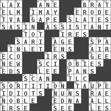 ACROSS 1. Not strict 4. A saturated hydrocarbon 7. Naughty child 11. Shade tree 12. "If ____ say so..." 13. Wear away 14. Federal power corp. 15. Yawn 16. Chalkboards 17. Indian antelope 19. Aide 21. Small child 23. Angers 24. Indian skirt 25. Mature 26. Health resort 29. An arm off of a larger body of water 30. Followers of ems 31. Atmosphere 32. Environmental prefix 33. Big collection agency 34. Turn to the right 35. ___ Haven, CT 36. _-fi 37. Off-Broadway awards 40. Begley and Asner 41. Area sheltered from the wind 42. Zero-star reviews 43. Glance over 45. Affectionate concern, for short 46. Drawing lots 51. Grayish beige 55. Foolish or stupid persons 56. Religious women 58. Actress Charlotte 59. Impressive in appearance 60. Pulitzer Prize-winning author Ferber 61. 100% 62. Celtic language 63. Perceive with the eye 64. French article DOWN 1. Allows 2. Inventor's middle name 3. Dec. holiday 4. Nursemaid (var.) 5. California wine valley 6. Sight organs 7. Naughty children 8. Roll call or roster of names 9. Arabian gulf 10. Trial 12. Disregard 13. Otherwise 16. Titles for men of rank and authority 18. Slanted text style (abbr.) 20. Omens 22. Teat (slang) 24. Overwhelms 25. Nest on high 26. Gurus 27. Sliced desserts 28. "We ___ not amused" (Victoria) 29. On the rocks 32. Compass dir. 33. Ancient Celtic tribe of eastern Britain 36. Narrow boards 37. Choose 38. Greek mezzo-soprano Agnes 39. South American Indian 43. Took without asking 44. Quote 46. Trig term 47. Scent 48. Chest bones 49. Singles 50. Unadorned 52. Mountain range 53. Diluted with white 54. Snakelike fish 57. Compass dir.