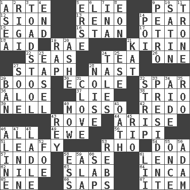 ACROSS 1. Johnson of "Laugh-In" 5. Writer Wiesel 9. Pacific Standard Time (abbr.) 12. The Jewish people; Israel 13. Former U.S. Attorney General Janet 14. Lightbulb-shaped fruit 15. Mild oath 16. Comedian Laurel of Laurel & Hardy 17. Von Bismarck 18. Assist 19. Actress Charlotte 21. Japanese brewing company 22. Oceans 24. Beverage made from leaves 26. Single 27. Staphylococcus 28. Political cartoonist Thomas 29. Scornful sounds 30. Learning spot: Fr. 32. Coast Guard woman 36. _ vera 37. Falsehood 38. Musical group of three 39. 1994 drama film starring Jodie Foster 40. With motion or animation 42. Do over again 43. Be footloose 44. Originate 46. 100% 49. She-sheep 50. Native american tent (variation) 51. Like summer trees 53. 17th letter of the Greek alphabet 54. ___ good deed 57. Southeast Asian peninsula 58. Comfort 61. Grant temporary use of 62. The longest river in the world 63. Thick slice 64. South American Indian 65. Compass dir. 66. Plant excrements 67. A whole individual unit DOWN 1. Toward the sea 2. Swiss mountan, "Queen of the Mountains" 3. Inedible or poisonous agaric 4. Conclude 5. Celtic language 6. Allow 7. _ tizzy (2 wds.) 8. Period of immesurable duration 9. Stone: prefix 10. Smooth fabric 11. Heavy duty weighing machine 14. Luau course 19. Hit sharply and swiftly 20. American tennis player Robert 21. Krazy ___ of comics 23. Artist's stand 24. Lies 25. Compass dir. 27. Flatfish 28. Annoying sound 29. Bar 31. Garlic unit 32. Empty completely 33. Elected leader of a country 34. Assistant 35. Friend of Pooh 40. Cut the grass 41. Pledge 43. Marina Del _, California 45. River (Sp.) 46. Place in a line 47. Soviet premier 1918-24 48. Dipping utensil 52. Enemy 53. Confederate soldiers (slang) 55. At one time in the past 56. First of billions? 58. Curvy letter 59. According to 60. Plant excrement 61. Cards in a Roman deck?