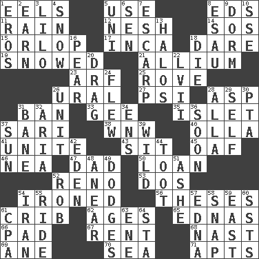 ACROSS 1. Snakelike fish 5. Purpose 8. Begley and Asner 11. Water falling in drops from the sky 12. Delicate 14. Distress signal 15. Lowest deck of a ship 17. South American Indian 18. Have the gumption 19. Overwhelmed 21. Plant genus of onion and garlic 23. Sandy's bark 25. Be footloose 26. Mountain range 27. 23rd letter of the Greek alphabet 28. Cleo's killer 31. Prohibit 33. Turn to the right 35. Small island 37. Indian skirt 38. Compass dir. 40. Water jar 41. Join together 43. Be seated 45. Clumsy lout 46. Teachers' org. 47. June honoree 50. Grant temporary use of 52. Western Nevada city 53. Two (Sp.) 54. Pressed 56. College papers 61. Baby bed with high sides 62. Grows older 65. Ferber et al. 66. Groovy apt. 67. Monthly bill 68. Political cartoonist Thomas 69. A saturated hydrocarbon 70. Ocean 71. Flats, for short DOWN 1. Greek god of love 2. Merit 3. _ and Stitch 4. Frozen precipitation 5. Single; one (prefix) 6. Elected rep. 7. Fortification 8. Son of Isaac 9. Dormintory (informal) 10. Compass dir. 13. Saint headwear 16. Lightbulb-shaped fruit 18. Pass on 20. To trail on the ground 22. 57 in ancient Rome 24. Soared 26. A single undivided whole 28. Silent film actress Nazimova 29. Automatically 30. Parent Teacher Association (abbr.) 31. Object of repulsion 32. Operatic vocal solo 34. Followers of ems 36. Within a short period 37. Player for Phoenix 39. Uncontrolled 42. Genesis locale 44. A blast of a horn 48. Approach 49. Evades 51. American tennis player Robert 52. Director Reiner 54. SW Asia republic 55. Travel on or in a vehicle 57. Pulitzer Prize-winning author Ferber 58. Fastener 59. Compass direction 60. Fast planes 61. Tax preparer (abbr.) 63. Compass dir. 64. R.R. building