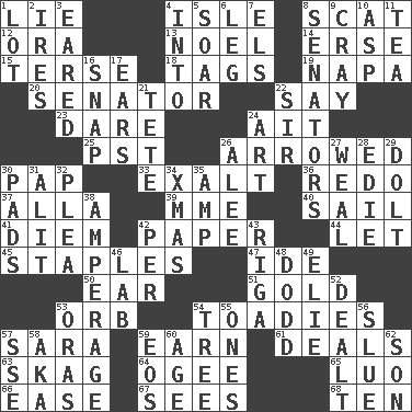 ACROSS 1. Falsehood 4. Small island 8. Go away! 12. Mouth or opening 13. Christmas carol 14. Celtic language 15. Laconic 18. Labels 19. California wine valley 20. Legislator 22. Declare 23. Have the gumption 24. Small island 25. Pacific Standard Time (abbr.) 26. Moved like an arrow 30. Infant food 33. Glorify 36. Do over again 37. Silent film actress Nazimova 39. Madame (abbr.) 40. Move on water 41. South Vietnam president (1954) 42. Some stationery 44. Allow 45. Paper fasteners 47. Binary compound 50. Hearing organ 51. Gilt 53. Globe 54. Sycophants 57. "Two Mules for Sister ____" 59. Merit 61. Allots cards 63. Heroin 64. Double curve, resembling the letter S 65. Nilotic language 66. Relaxation 67. Perceives with the eye 68. "___ Little Indians" DOWN 1. Car dealer's back yard 2. Angers 3. Having ears or earlike features 4. To the inside or interior of 5. Fly high 6. Part of a journey 7. Raised railways 8. Legislators 9. Supercomputer manufacturer 10. Cleo's killer 11. Afternoon social gathering 16. Fastener 17. Hearing organs 21. False hair 22. Title for a knight 24. Nonscientific branch of learning 26. Toward shelter 27. Welt 28. Singer Brickell 29. Stupid person 30. Writing tablets 31. Came down and settled, as after flight 32. Entreaty 34. Dec. holiday 35. Electrical Unit 38. Electrical Measurement 42. For each 43. Capital of Latvia 46. Experiment locale 48. Texas town _ City 49. Writer Wiesel 52. Started a card game 53. Mouths or openings 54. Family _ (genealogy) 55. Singles 56. Turn sharply 57. Compass dir. 58. Alias (abbr.) 59. Greek goddess of the dawn 60. Personal question 62. Male offspring