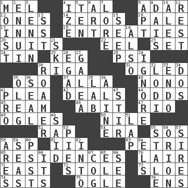 ACROSS 1. Cartoonist voice _ Blanc 4. Slanted text style (abbr.) 8. The sixth month of the Jewish calendar 12. Washington bills 14. Nothings 16. Diluted with white 17. Lodging establishments 18. Pleas 20. Sets of matching outer garments 22. Snakelike fish 23. Arrange properly for use 24. Metal container 25. Barrel 28. 23rd letter of the Greek alphabet 30. Capital of Latvia 31. Stared 35. Bear (Spanish) 37. Silent film actress Nazimova 40. Words to Nanette 41. Entreaty 42. Allots cards 44. Likelihood 45. 480, 500 or 516 sheets of paper 46. "This won't hurt ____!" 47. River (Sp.) 48. Stares at amorously 50. The longest river in the world 52. Reproach for some lapse or misdeed 54. Period 55. Mayday 58. Viper 61. One more than two 63. _ dish (used to culture cells) 65. Dwellings 70. Den 71. 90 degrees 72. Took without asking 73. _ gin 74. Fast planes 75. Stare 76. Followers of ems DOWN 1. Damp 2. World-weariness 3. Soviet premier 1918-24 4. Ending with capital 5. "___ Little Indians" 6. Tate display 7. Old wives' tales, e.g. 8. Fitting 9. Raised platform 10. Toward shelter 11. State of inaction 13. Fast jet (abbr.) 15. Ooze 19. In addition 21. What Jean-Claude Killy likes to do 26. Mild oath 27. An organ shaped like a helmet 29. Snub 30. Nomad 32. Farming town in central California 33. Inside; within (prefix) 34. Two (Sp.) 35. Cassini of fashion 36. Lick closed 38. Experiment locale 39. Place in a line 41. Adept person 43. Use a spoon 49. Alleged 51. Infant locale 53. Sliced desserts 55. Lacking originality or spontaneity 56. Constellation of myth 57. Begets 58. Ancient Greek god of war 59. Oceans 60. Inconspicuous attention getter 62. To the inside or interior of 64. Raised railways 66. ___ a Wonderful Life 67. Gear tooth 68. Pipe bend 69. Perceive with the eye