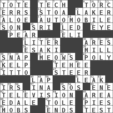 ACROSS 1. Carryall 5. Technical 9. Torque (variant) 13. Blunders 14. Portico 15. Member of a famous L.A. basketball team 16. _ vera 17. Form of transportation 19. Boy, to dad 20. Indian title of respect (Mr.) 21. Directed 22. Sight organ 23. Lightbulb-shaped fruit 25. Connecticut Ivy Leaguer 26. 61 cubic inches 30. Ancient Greek god of war 34. 1973 Nobel Price Winner (Physics) Leo 35. Place where flour is made 36. Fastener 39. Catcalls? 42. Many (prefix) 43. Seaweed 44. Giggle 46. "Tell ____ the Marines!" 47. Bull 48. Pet locale 51. Path through which fluid escapes 54. Big collection agency 57. _ tizzy (2 wds.) 58. Distress signal 60. Compass dir. 62. Boob tube 65. Length times width 66. Peak District village in England 67. Lacquered or enameled metalware 68. Sliced desserts 69. Crowds into 70. Extremities 71. Trial DOWN 1. Beverages made from leaves 2. Fourth or lowest deck 3. Heavy duty weighing machine 4. Compass dir. 5. Russian ruler of old 6. Needle holder 7. Small bed 8. White Person, in Hawaii 9. Keyboard key 10. Migrant worker of the '30s 11. Have confidence or faith in 12. Algonquian 15. Farming town in central California 18. Cartoonist voice _ Blanc 20. Indian titles of respect 24. City in Syria 27. Scottish cap 28. Supplement with great effort 29. Debaucheries 30. Electrical Unit 31. _ de Janeiro 32. Pipe bend 33. Cunning 36. What Jean-Claude Killy likes to do 37. Remaining after all deductions 38. The first octave above the treble staff 40. Soggy 41. A female animal or person 45. Snakelike fish 48. Moving, as bait 49. Black tropical American cuckoo 50. Thick mixture 52. Nest on high 53. Leg joints 54. A whole individual unit 55. Redecorate 56. Thick slice 58. Disposed of to a purchaser 59. Singles 61. 90 degrees 63. Raised railways 64. Electrically charged atom 65. Fitting