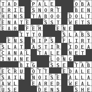 ACROSS 1. Small boy 4. Diluted with white 8. Chief or king in Benin or Nigeria 11. 4th largest of the Great Lakes 13. Derisive sound 15. Benjamin's nick name 16. Coop moms 17. Off limits 18. Stupid person 19. Maternal 21. Fast jet (abbr.) 22. Moistens 23. Ewer handle 24. Opposite of masc. 27. Compass dir. 29. "Tell ____ the Marines!" 30. Broad, flat, thick pieces 34. Followers of ems 36. Pinches, bites 39. Talk or behave amorously 40. Narrow board 41. Having gotten out of bed 43. The main thing one is thinking about 44. Lessep's creation 46. Story 47. Fish or hair follower 48. Silly 49. Having great length 51. Large 53. Compass dir. 54. Keyboard key 57. Shade of tan 60. Baseball player Mel 63. Peak District village in England 65. Travel by water 66. Annoying sound 69. Silent film actress Nazimova 70. Leather borer 71. Having ears or earlike features 72. Welt 73. Purpose 74. Hiding places for outlaws 75. A female animal or person DOWN 1. Giggle 2. Sports stadium 3. Middle Eastern gold or silver currency 4. Pacific Standard Time (abbr.) 5. Santa ___, CA 6. Tennis shots 7. Greek god of love 8. Mitch Miller's instrument 9. Waist strap 10. Pismires 12. Eastern Standard Time (abbr.) 14. Haul 18. Home 20. Lizard (obsolete) 25. Inactive volcano in Sicily 26. Wet 28. Science/research agcy. 29. Byzantium, centuries later 31. Helper 32. Cy Young winner Saberhagen 33. R.R. building 34. Flair 35. Grandmother 37. Parent Teacher Assoc. 38. Beverly of Met fame 40. _-fi 42. Vintage cars 45. Luau accessory 50. Born 52. Went 54. Falsehoods 55. Assad's deity 56. Calif. Air Force Base 57. Son of Isaac 58. Crow sounds 59. Cause heat under the collar 61. Frog relative 62. Hoop that covers a wheel 64. Obsolete 67. Elected rep. 68. Begley and Asner