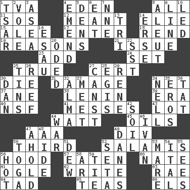 ACROSS 1. Federal power corp. 4. Genesis locale 8. 100% 11. Distress signal 12. Intended 14. Writer Wiesel 15. Toward shelter 17. Keyboard key 18. Tear apart 19. Thinks logically 21. Come out of 23. Say or write further 24. Arrange properly for use 25. Loyal 27. An absolute certainty 30. Expire 31. Break 34. Fish or hair follower 37. One (Scot) 38. Soviet premier 1918-24 39. Epoch 40. Science/research agcy. 41. Makes clutter 43. Car dealer's back yard 44. Electrical Unit 45. Petroleums 47. American Automobile Association (abbr.) 49. HTML Container Element 50. One of three equal parts 52. Deli grouping 56. Parka part 57. Ingested 60. Nathan's nickname 61. Stare 62. Compose 63. Actress Charlotte 64. Bit 65. Afternoon social gatherings 66. Raised railways DOWN 1. Russian ruler of old 2. Short-tailed, large-bodied rat 3. Toward the sea 4. Make improvements or corrections to 5. Habitations of wild animals 6. Erode 7. Compass dir. 8. Native American of Southwest Alaska 9. Actor's bit 10. Directed 13. Three (prefix) 14. Celtic language 16. He sold his birthright 20. Wrote a lyric poem 22. Fast jet (abbr.) 25. Canisters 26. Coral collection 27. 2nd pers. sing. pres. of can (arch.) 28. The front part of a cuirass 29. French philosopher Descartes 30. One of the 12 tribes of Israel 32. _ mater 33. Rendezvous 34. 1994 drama film starring Jodie Foster 35. Greek god of love 36. Make lace 42. The visible part of the earth's surface 44. Armed conflict 46. "Terrible" tsar 47. Hold, grip (Informal) 48. Helper 49. Natives or inhabitants of Denmark 50. Ancient Roman robe 51. Morning condensation 52. Bristle 53. Female horse 54. Slanted text style (abbr.) 55. Perceives with the eye 56. Being at a high temperature 58. Tate display 59. Neckwear