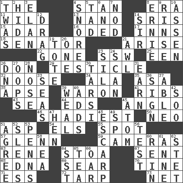 ACROSS 1. Definite Article 4. Comedian Laurel of Laurel & Hardy 8. Period 11. Rampant 13. Billionth: prefix 14. Indian titles of respect 15. The sixth month of the Jewish calendar 16. Wrote a lyric poem 17. Lodging establishments 18. Elected representative 21. Ascend 22. Went 23. Compass dir. 25. Car or cant ending 26. Spanish title 29. One of the two male reproductive glands 32. Trap for birds or small mammals 34. In the manner of 35. White ___ sheet 38. Domed church section 39. Make _____ (do battle with) 41. Teases 43. Ocean 44. Begley and Asner 45. White American of non-Hispanic descent 46. Most dark, concealed or hidden 50. Modern: prefix 51. Cleo's killer 54. Raised railways 55. Specific locale 57. American astronaut and politician John 59. Devices for capturing images 63. French philosopher Descartes 64. Portico 67. Transmitted 68. Pulitzer Prize-winning author Ferber 69. Dry up 70. Prong on a fork 71. Double-curved letter 72. Canvas cover 73. Fish or hair follower DOWN 1. It was, poetically 2. Flintstone garb 3. Style 4. Sounds asleep 5. Bit 6. A saturated hydrocarbon 7. Dreamland 8. Bert's buddy 9. Remove soap 10. NE Netherlands city 12. To draw with force 14. Title for a knight 19. Carryall 20. Single 21. Leather borer 23. Grain storage tower 24. Glance over 26. Heredity factor (abbr.) 27. I made a mistake 28. Sense of smell 30. Tarsus (plural) 31. Merit 33. Oceans 36. Attach a signature 37. Competent 39. Welt 40. Does sums 42. "Barney Miller" actor Jack 45. Smallest unit of an element 47. Layer 48. Fortification 49. Health resort 51. Match 52. Bobsleighs 53. Actor Sean's family 56. Trial 58. Teachers' org. 60. It's straight from the horse's mouth 61. Queen of England 1702-14 62. Proofreading order 64. Fast jet (abbr.) 65. Beverage made from leaves 66. Rowing implement