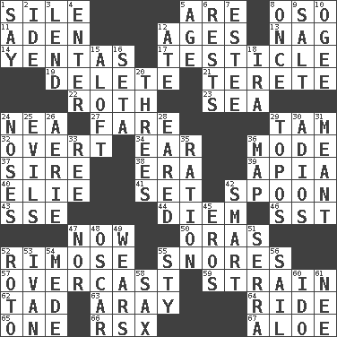 ACROSS 1. Filth; sediment 5. "We ___ not amused" (Victoria) 8. Bear (Spanish) 11. An important port of Yemen 12. Ripens 13. Tired old horse 14. Gossips 17. One of the two male reproductive glands 19. Erase 21. Cylindrical with tapered ends 22. Writer of Portnoy's Complaint (1969) 23. Ocean 24. Teachers' org. 27. Conductor's collection 29. Scottish cap 32. Unconcealed 34. Ewer handle 36. Method 37. Father 38. Period 39. Capital of Western Samoa 40. Writer Wiesel 41. Arrange properly for use 42. Soup utensil 43. Compass dir. 44. South Vietnam president (1954) 46. Fast jet (abbr.) 47. At this time 50. Mouths or openings 52. Full of chinks, cracks, or crevices 55. Sounds asleep 57. Cloudy 59. Put through a sieve 62. Bit 63. Like ___ of sunshine 64. Travel on an animal 65. Single 66. Acura sports coupe 67. _ vera DOWN 1. Declare 2. Binary compound 3. Grant temporary use of 4. Keyboard key 5. Ripen 6. Musical pauses 7. First name in cosmetics 8. At one time in the past 9. Table seasoning 10. Double curve, resembling the letter S 12. Had dinner 15. Upward 16. Stalk of a moss capsule 18. Retirement account (abbr.) 20. Threesomes 24. Olfactory organs 25. Vices 26. Nest on high 28. Having ears or earlike features 29. Traditional theme or motif 30. Goodbye (Sp.) 31. Intended 33. Portuguese money of account (variant) 35. Food allowance for one day 36. Atlas unit 42. Don Adams' spy role 45. Greek god of love 47. And not 48. Witty Wilde 49. Puts on (as clothing) 51. Father Junipero _ 52. Printing process, for short 53. "Terrible" tsar 54. Ancient Persian 55. Filthy place 56. Move on water 58. Saxophone 60. Wedding promise 61. Born
