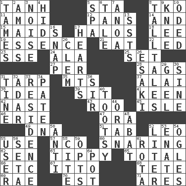 ACROSS 1. Hyperbolic tangent 5. R.R. building 8. Ring climax 11. Mine, in Marseilles 12. Baking dishes 14. Added to 15. Women servants 17. Auras 18. Area sheltered from the wind 19. Substance 21. Consume 22. Directed 23. Compass dir. 24. Wing 25. Arrange properly for use 27. For each 28. Droops 31. Canvas cover 35. Mountains (abbr.) 37. Jai ____ 38. The content of cognition 39. Be seated 41. Peachy ____! 42. Political cartoonist Thomas 43. Friend of Pooh 45. Capri or Wight 46. One of the Great Lakes 47. Mouth or opening 49. Heredity factor (abbr.) 51. Keyboard key 52. Lion 55. Purpose 57. Non-commissioned officer (abbr.) 60. Catching in a trap 62. Elected rep. 63. Likely to tip or tilt 65. Add up to 66. And so on (abbr.) 67. "Tell ____ the Marines!" 68. Wig 69. Actress Charlotte 70. Eastern Standard Time (abbr.) 71. Ancient Greek god of war DOWN 1. Softens 2. Collect or gather 3. Annoying sound 4. Flintstone garb 5. Health resort 6. Lie 7. Small Philippine buffalo 8. Baron Munchausen's specialties 9. Leg joint 10. Wrote a lyric poem 13. Fast planes 16. Fastener 17. Centers 20. Clement's nick name 26. 1973 Nobel Price Winner (Physics) Leo 29. Highlander 30. Trig term 31. Prong on a fork 32. The sixth month of the Jewish calendar 33. Dwelling 34. Eucharist need 36. Title for a knight 40. A girl or young woman (variant) 44. Northwest Algerian city 48. Blind as ____ 50. Opposed to 52. 61 cubic inches 53. Maternal 54. Stares 55. One who uses or employs something 56. Bristle 58. Quote 59. Elects 61. Round or rotation of duties 64. Cooking vessel